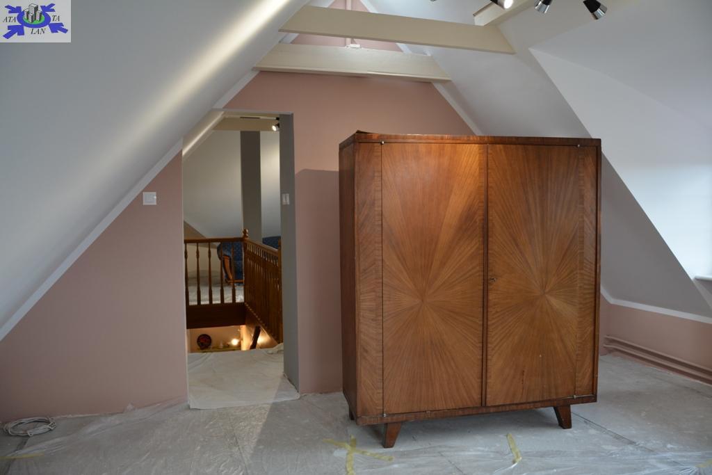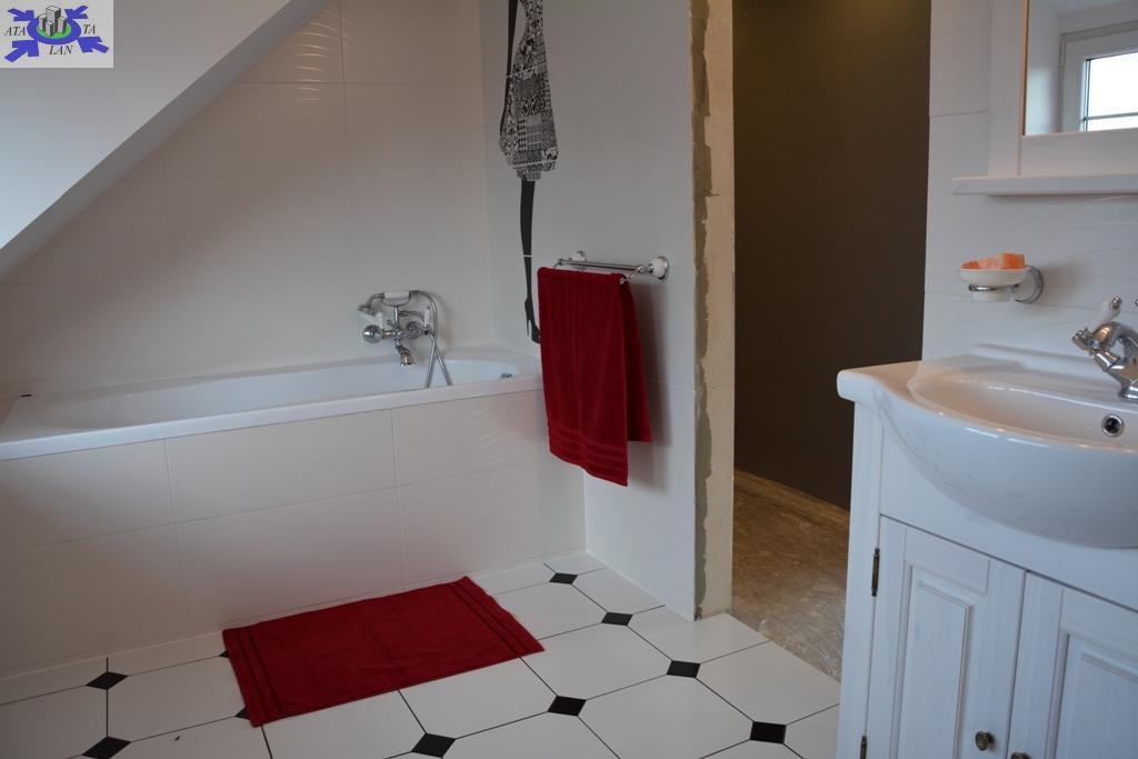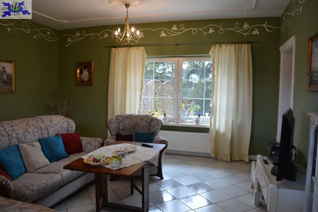 Cały parter wykończono z dbałością o detale. W kuchni, hallu, salonie i na korytarzu na podłodze wysokiej jakości kafle, ściany gładzone i malowane, liczne zdobienia. Duża sypialnia na podłodze panele, ściany gładzone, malowane, również częściowo położono ozdobną tapetę, szafa w zabudowie. Obok mniejszy pokój, pełniący rolę gabinetu. Duży pokój kąpielowy z wanną oraz oddzielna toaleta z umywalką w ładnej, nowoczesnej glazurze i terakocie. Na piętro prowadzą szerokie drewniane dębowe schody. Na piętrze duża przestrzeń typu open space z wyjściem na balkon, trzy pokoje (jeden z wyjściem na osobny balkon), garderoba oraz pokój kąpielowy. Ściany w pomieszczeniach gładzone, malowane. Pokój kąpielowy wykończony ze starannością nowoczesna glazura, terakota, wanna w zabudowie. Z hallu zejście do piwnicy oraz wyjście na duży taras (około 20m2) i ogród.