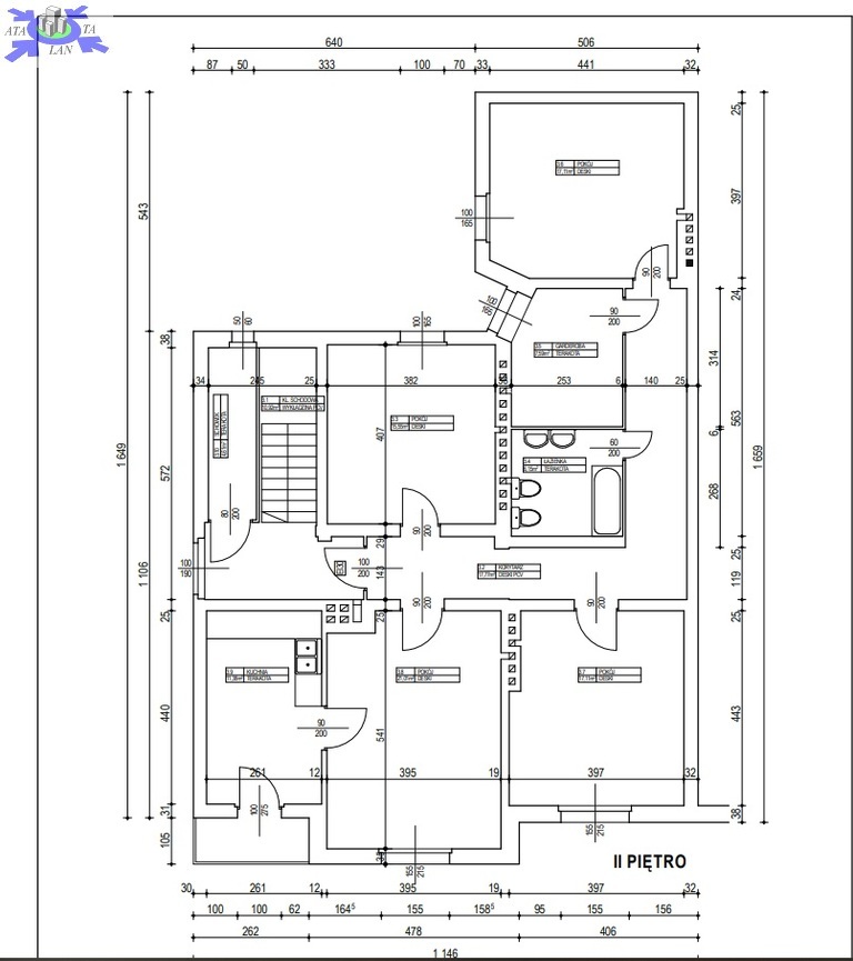 Mieszkanie na 2. piętrze ma powierzchnię 114 m2 składa się z 4. pokojów gdzie na podłodze położono deskę a terakotę w garderobie, kuchni, łazience i korytarzu
