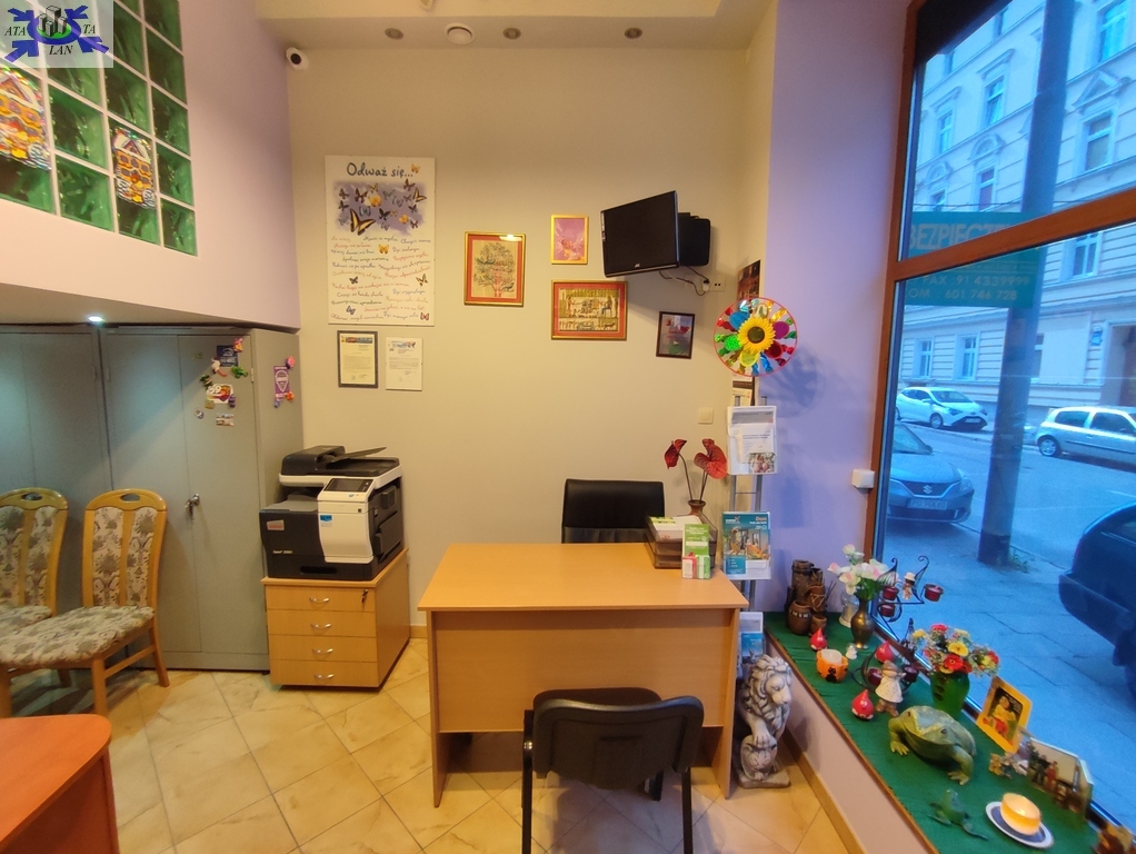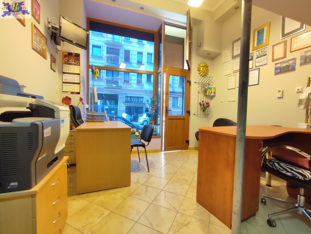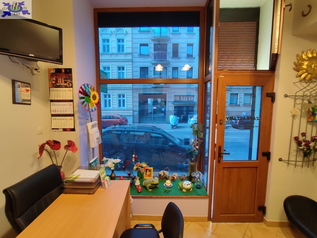 Lokal posiada własne wejście bezpośrednio z ulicy oraz dużą - ponad siedmiometrową witrynę. Lokal w ciągu ostatnich lat przeszedł generalny remont (ostatnie prace remontowe rok temu) i oferowany jest do sprzedaży w bardzo dobrym standardzie. W głównym pomieszczeniu ulokowane są dwa stanowiska biurowe (biurka plus fotele i krzesła) oraz mini poczekalnia gdzie znajduje się sofa. Tylna część lokalu to zaplecze socjalne, w którym znajdują się osobna toaleta z umywalką oraz aneks kuchenny (m.in. zlew, mikrofala i czajnik elektryczny) zasłonięty przesuwanymi szklanymi drzwiami. Dodatkowo za jednym z biurek usytuowane są kręcone schody, którymi wchodzimy na antresolę o powierzchni około 7m2 (nie wliczona w powierzchnię użytkową lokalu). Antresola jest częściowo przeszklona ozdobnymi luxferami.