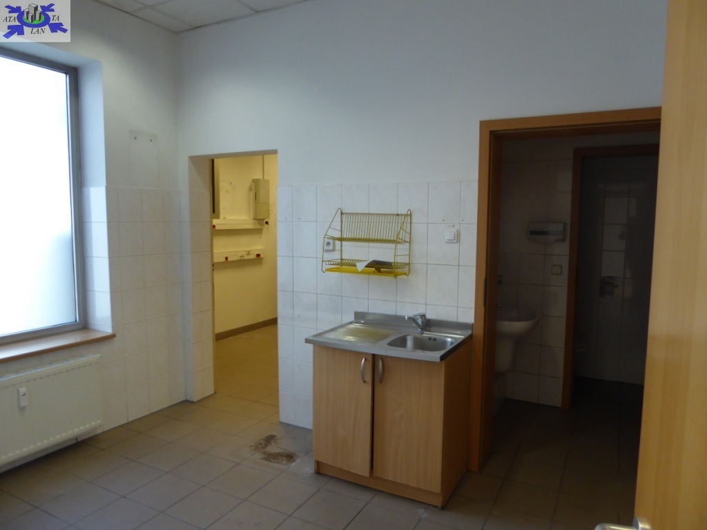 Na podłodze wykładzina, w części kafle, ściany gładzone i malowane. Toaleta w glazurze i terakocie. Sufit podwieszany z zamontowanym oświetleniem rastrowym. Pomieszczenie biurowe z dużymi oknami od strony zaplecza.