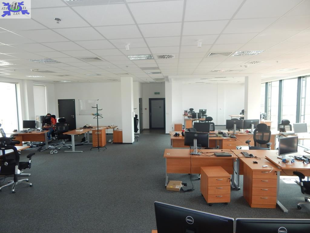 Na podłogach biura wykładzina przemysłowa (pod spodem podniesiona tzw. podłoga techniczna z puszkami podłogowymi), sufity podwieszane z oświetleniem rastrowym.