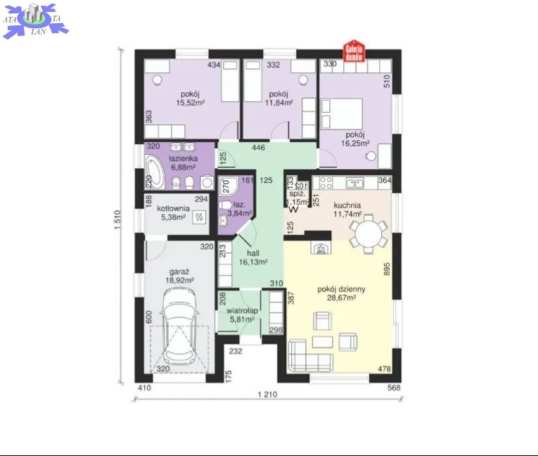 Na sprzedaż dom parterowy w stanie deweloperskim w Bobolinie blisko Szczecina, 15 min do centrum ! Powierzchnia całkowita domu wynosi 179,52 m2, powierzchnia użytkowa 117 + garaż 142 m2 na działce o powierzchnii 1152 m2. Na powierzchnię 179,52 m2 składa się salon 26,67 m2 z aneksem kuchennym 11, 74 m2, wydzielona spiżarnia 1,15 m2, 3 sypialnie 16,25 m2, 15,52 m2, 11,84 m2, 2 łazienki 6,88 m2, 3, 84 m2, kotłownia 5, 38 m2, hall 16,13 m2, wiatrołap 5, 81 m2, garaż jednostanowiskowy w bryle 18,92 m2. Kąt nachylenia dachu wynosi 25 stopni, wysokość budynku 6,69 m. Dom idealnie nadający się dla rodziny 2+2 z podziałem na strefę dzienną, salon z kominkiem, z wyjściem na taras oraz strefę nocną prowadzącą przez dość długi korytarz w jednej lini kompleks sypialni. Dodatkowo możliwość adaptacji strychu zyskując przy tym około 20 m2. Wielkim atutem domu jest położenie względem stron świata, przez co salon z wyjściem na taras będzie większości dnia nasłoneczniony, co sprzyja domownikom przy korzystaniu z ogrodu.