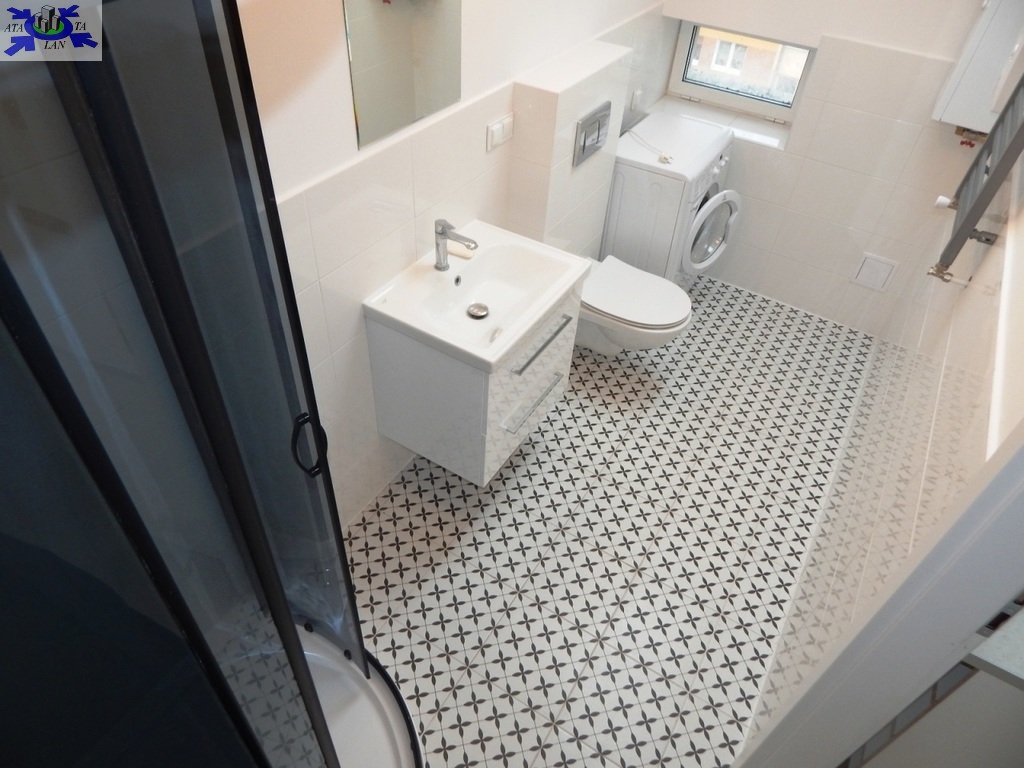 Na powierzchnię około 36 m2 składają się salon z aneksem kuchennym (ok. 26 m2) z kanapą z funkcją spania, stolikiem jadalnianym z dwoma krzesłami, dużą szafą. W aneksie meble w zabudowie, pełnowymiarowa, wolnostojąca lodówka SAMSUNG, płyta grzewcza elektryczna łazienka w gustownej, nowoczesnej glazurze i terakocie (5 m2) z kabiną prysznicową, WC pralka na wyposażeniu korytarz (ok. 4 m2).
