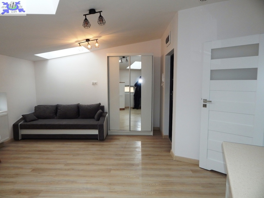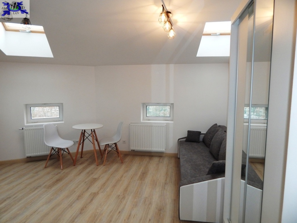 Powierzchnia ok. 26 m2 to salon z aneksem kuchennym (ok. 21 m2) z kanapą z funkcją spania, stolikiem jadalnianym z dwoma krzesłami, dużą szafą. W aneksie meble i lodówka w zabudowie, płyta grzewcza elektryczna łazienka w gustownej, nowoczesnej glazurze i terakocie (5 m2) z kabiną prysznicową, WC pralka na wyposażeniu.