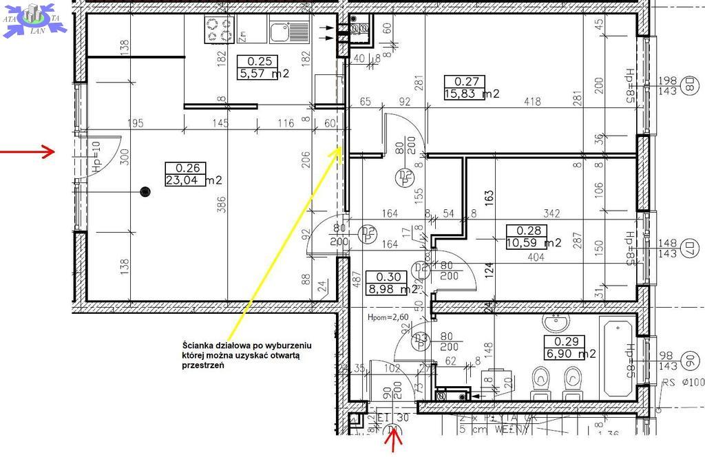 Obie części przedzielone są jedynie ścianką działową - możliwe jest jej usunięcie i połączenie obu stref w celu uzyskania pierwotnego podziału pomieszczeń na mieszkanie 3 pokojowe.
