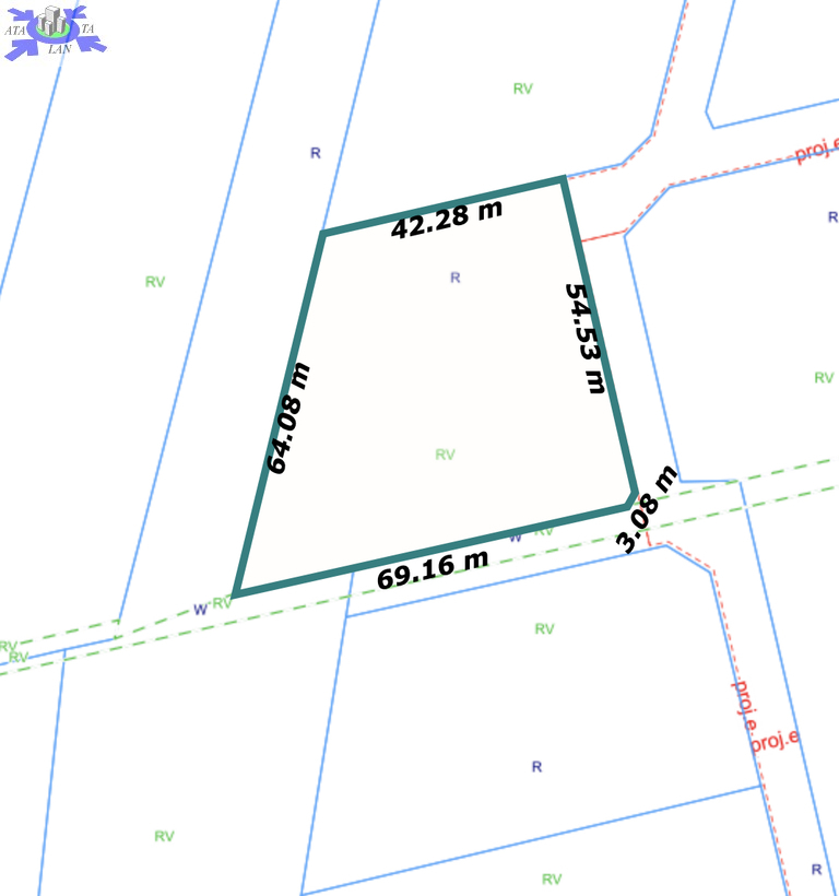Kształt działki zbliżony do trapezu, wymiary ok. 43m x 54m.
