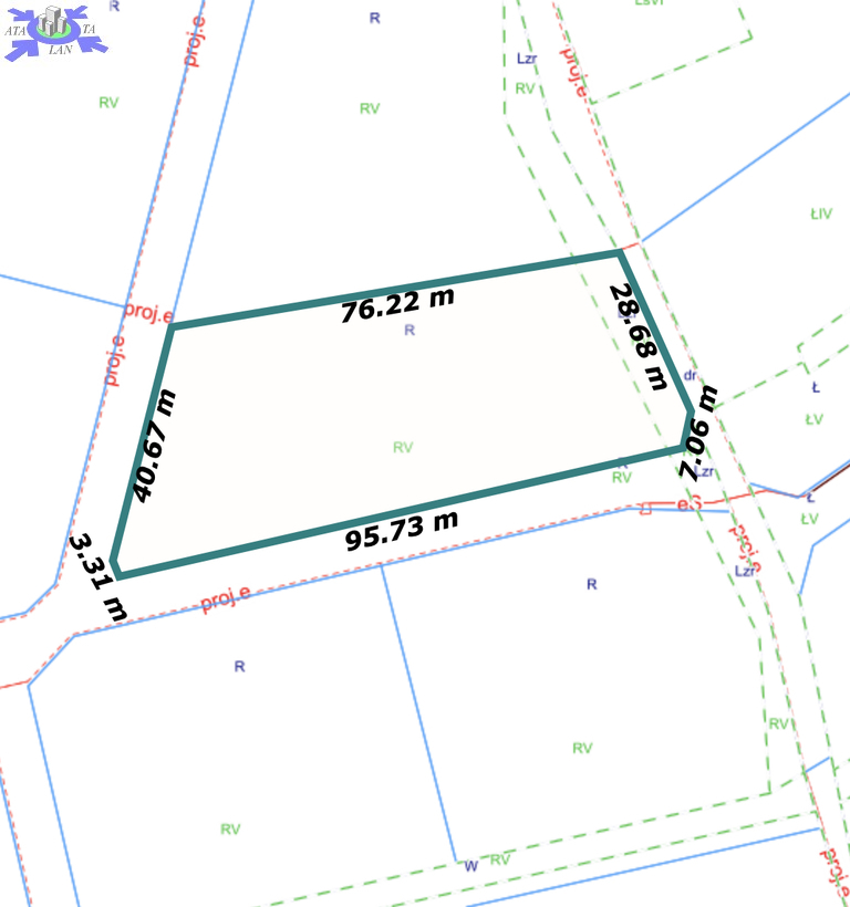 Kształt działki zbliżony do trapezu, wymiary ok. 40m x 48m.