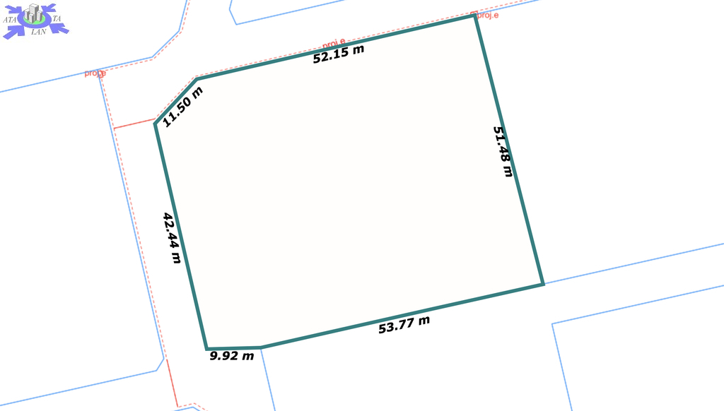 Kształt działki zbliżony do prostokąta, wymiary ok. 60m x 50m.
