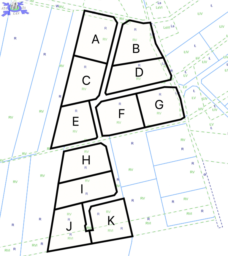 Dostępnych jest łącznie 7 działek z wydanymi warunkami zabudowy oznaczone jako "A"-"G" (3023m2 3115m2 3128m2 3181m2 3211m2 3235m2 oraz 3405m2) oraz 4 zalesione działki bez wydanych warunków zabudowy oznaczone jako "H"-"K" (3039m2 3044m2 3045m2 oraz 3121m2).