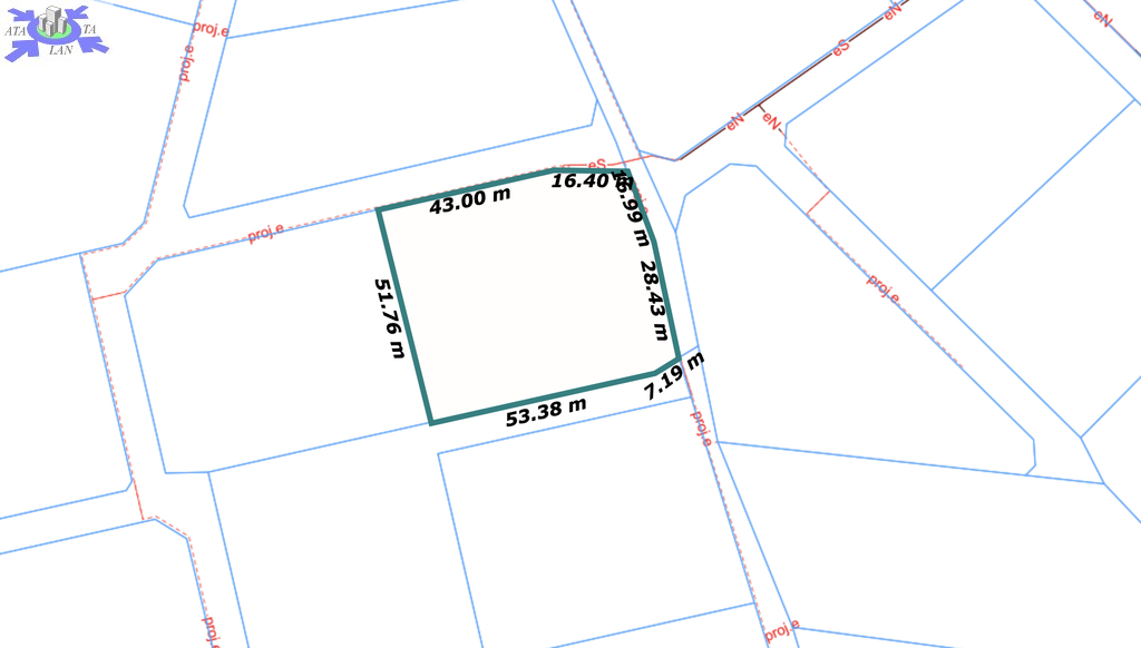 Kształt działki zbliżony do prostokąta, wymiary ok. 57m x 50m.