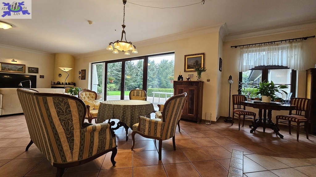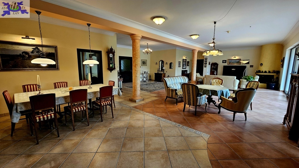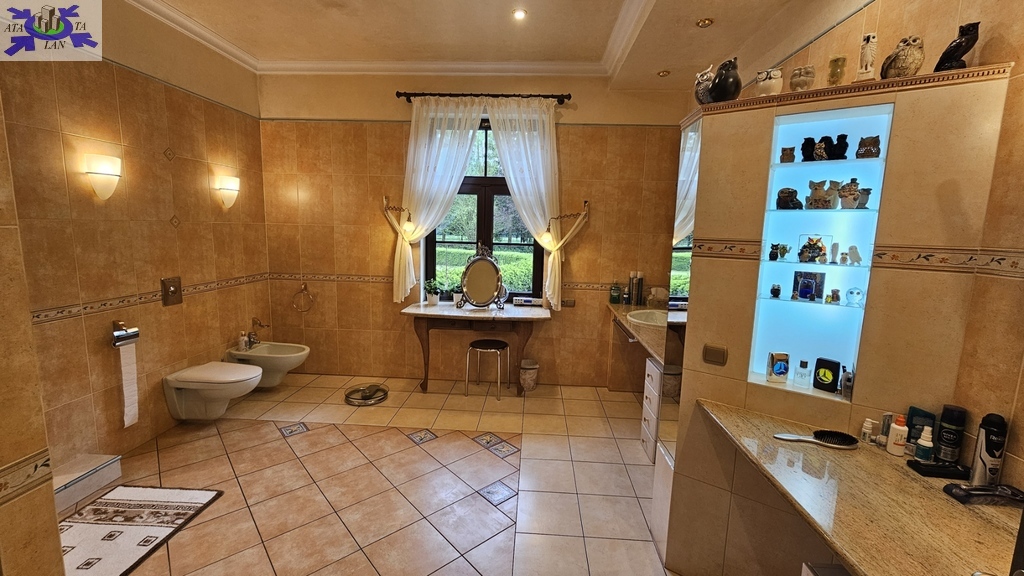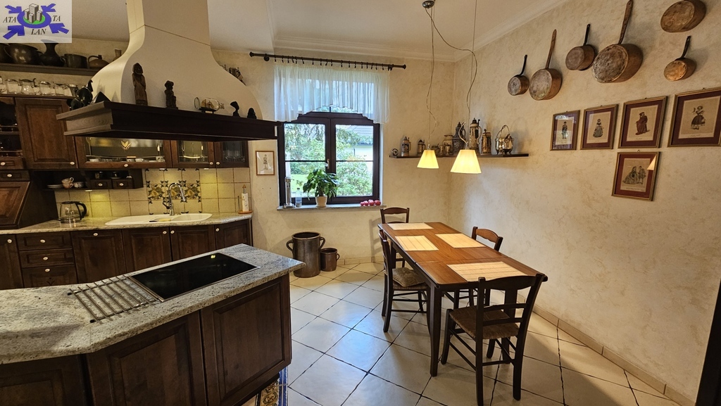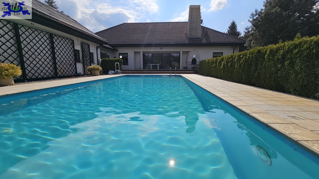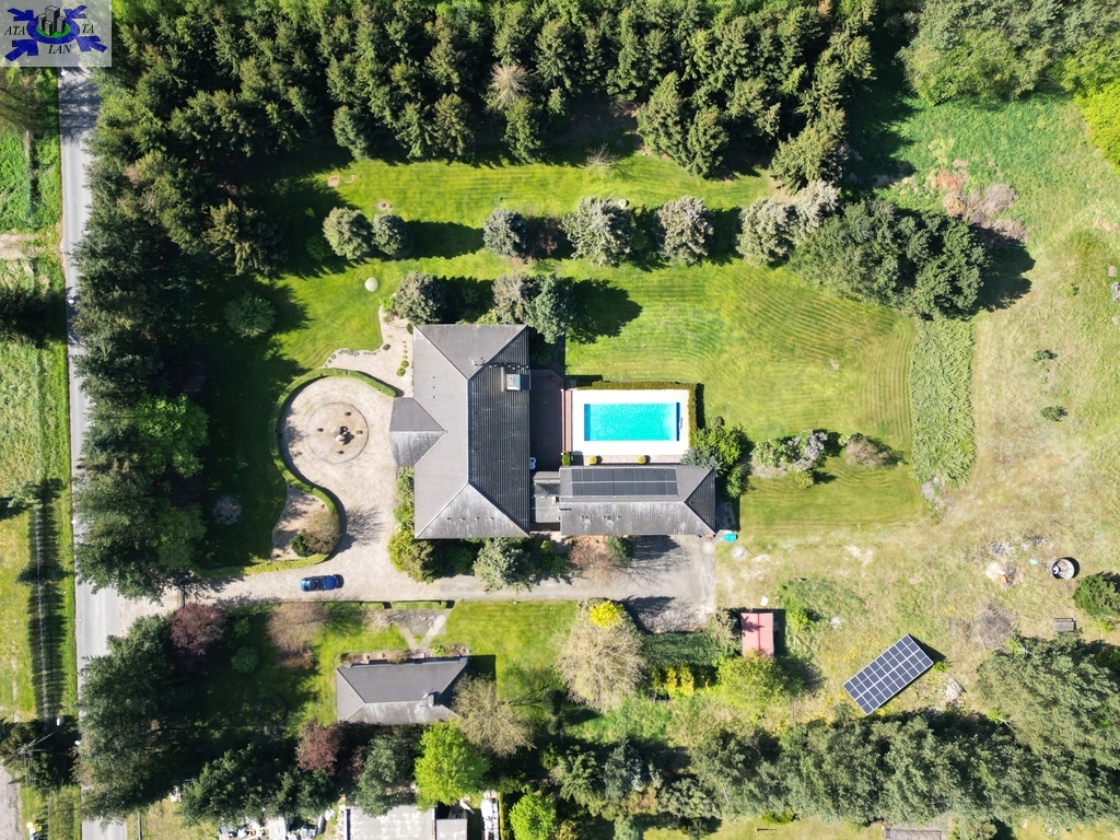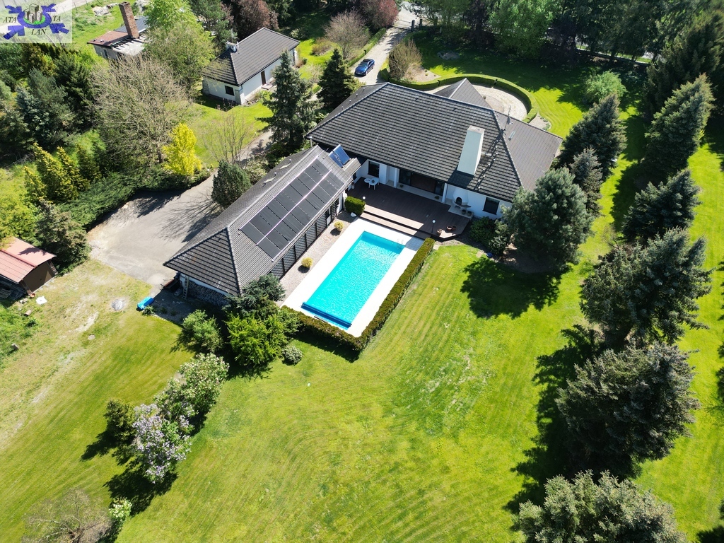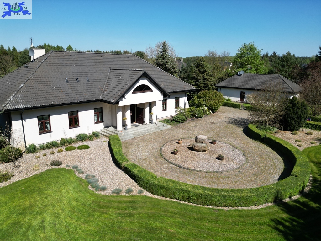 Do sprzedania nietuzinkowa rezydencja położona na dwu hektarowej działce otoczonej otuliną prywatnego lasu. Nieruchomość wybudowana w formie dworku z prywatnym basenem jeziorkiem oraz domkiem dla gości. Całość domu wybudowana w 2001 roku z bloczków firmy Fortis pokryta dachówką cementową. Okna PCV z szybami antywłamaniowymi w kolorze palisander. CO i CW własne gazowe + wspomaganie poprzez baterie solarne. Zamontowana instalacja fotowoltaiczna o mocy 9,5 kWh co w całości pokrywa zapotrzebowanie w energie elektryczną całego domu. Na 716 m powierzchni całkowitej składają się hol, WC, trzy sypialnie, kuchnia, jadalnia, spiżarnia, trzy łazienki razem z WC, pomieszczenia gospodarcze, pralnia, pokój relaksu z sauną, garaż trzy stanowiskowy z kanałem. 113- metrowy salon z wyjściem poprzez system panoramicznego okna przesuwnego typu HS na duży taras i zejście do basenu. Kominek w salonie + kominek z grillem za tarasie ogrodowym. Basen o wymiarach 12x5, woda z własnego ujęcia ze studni ogrzewana poprzez maty solarne oraz pompę ciepła. Całość poddasza użytkowego wielkości 288 m2 do dodatkowego zagospodarowania. Obok domu znajduje się 70 m2 całoroczny domek dla gości (salon +sypialnia + kuchnia +łazienka). Część ogrodowa wyposażona w system automatycznego podlewania z własnej studni głębinowej. Całość posesji zagospodarowana 30-sto letnim drzewostanem z wkomponowanym zarybionym stawem. Dwa lata temu została wymieniona na zupełnie nową oczyszczalnia biologiczna dla całej posesji. Rezydencja dla osób cenionych prywatność spokój i komfort. Zapraszamy na prezentację opisywanej rezydencji. Chcesz się poczuć luksusowo to zapraszam do osobistej weryfikacji i kontaktu z maklerem prowadzącym.