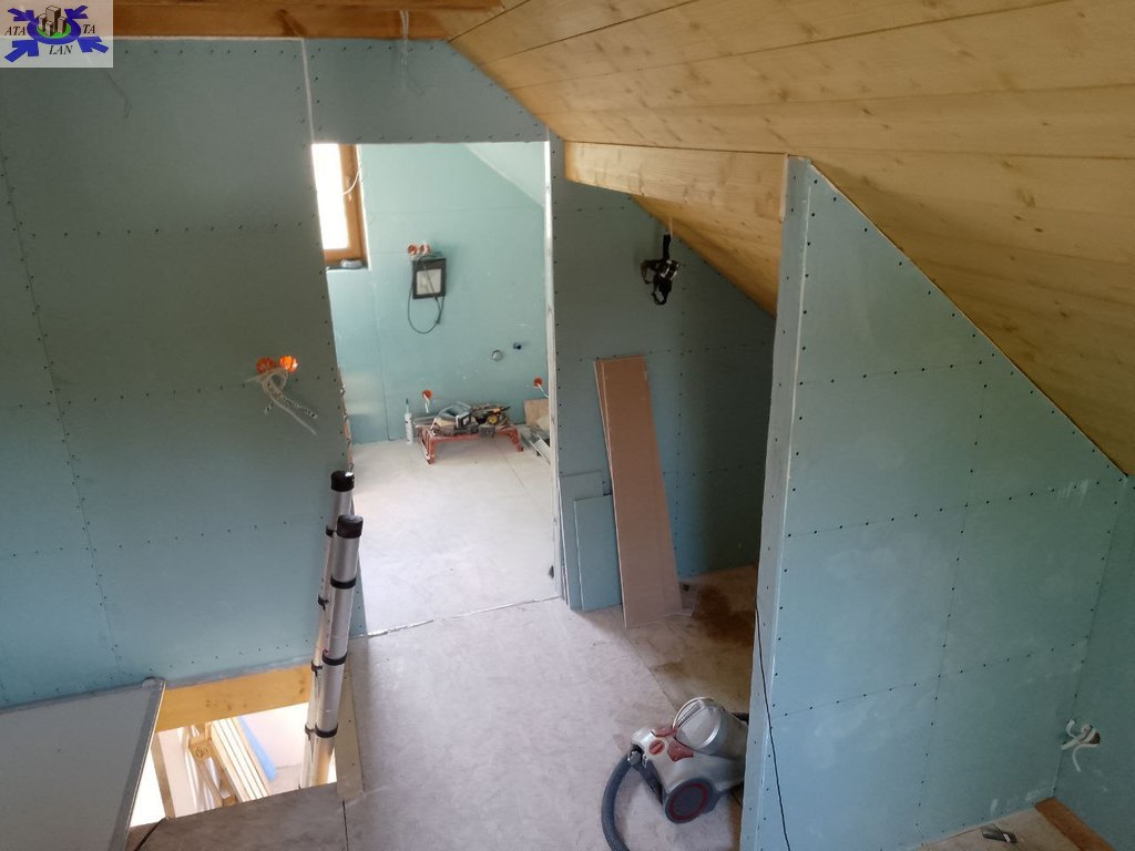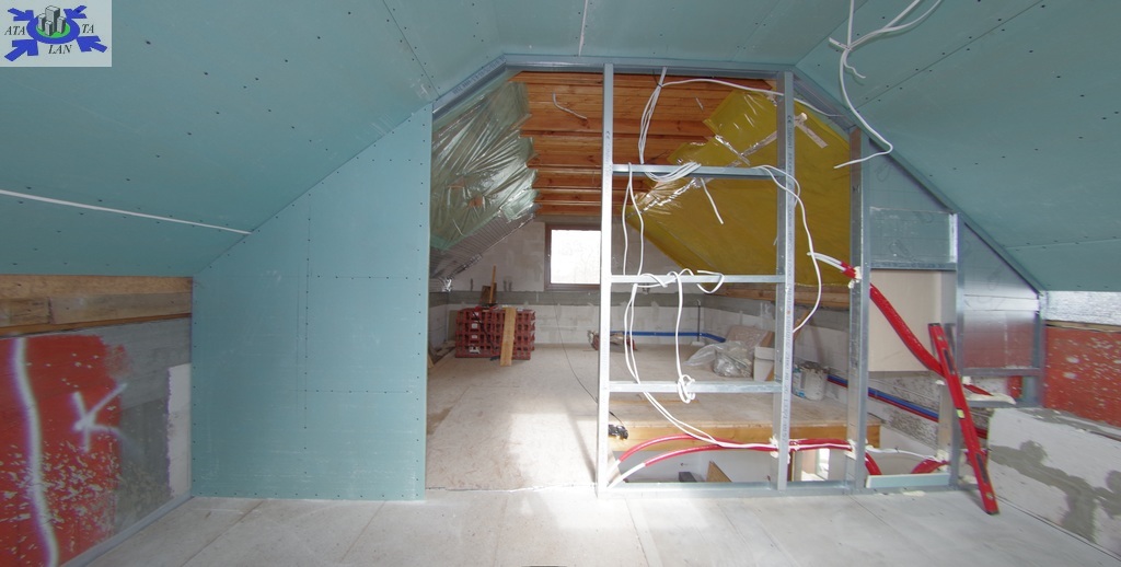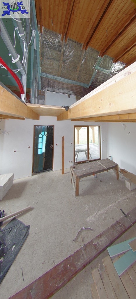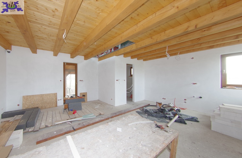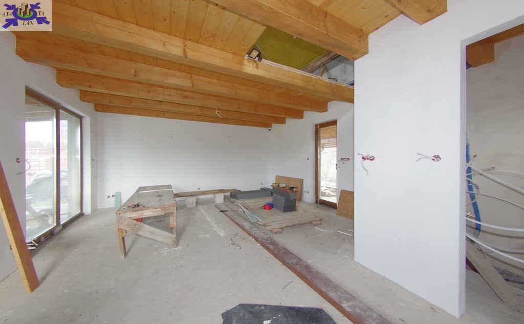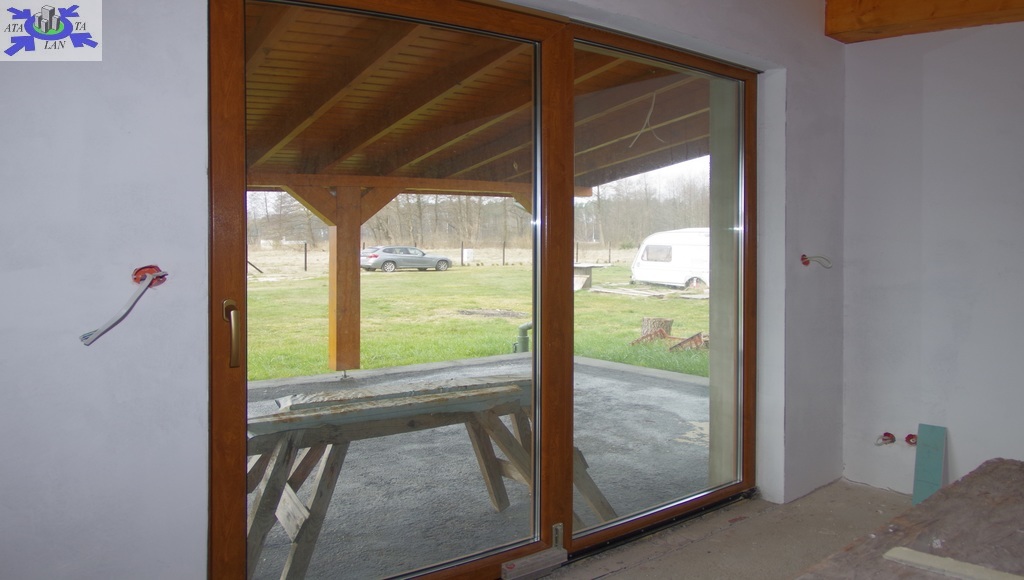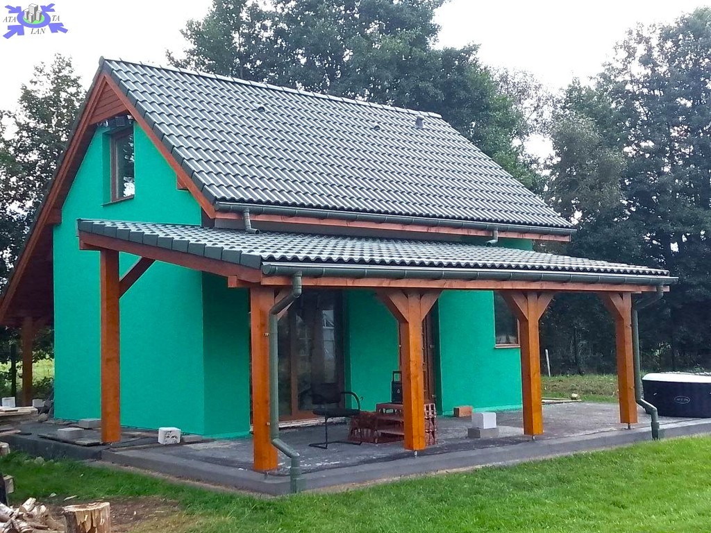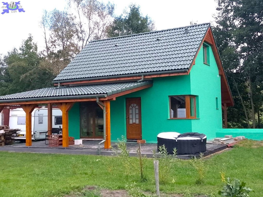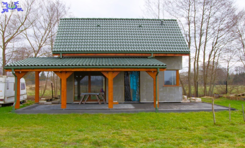 Dom pow. całkowita 70 m 2 ( 35 m 2 parter + 35 m 2 poddasze) . W części dolnej salon z aneksem kuchennym , łazienka z w c . Z salonu wyjścia na zadaszone tarasy po obu stronach domu ( wschód- zachód) . Poddasze to łazienka oraz 1 lub 2 pokoje w zależności od aranżacji i potrzeb.
