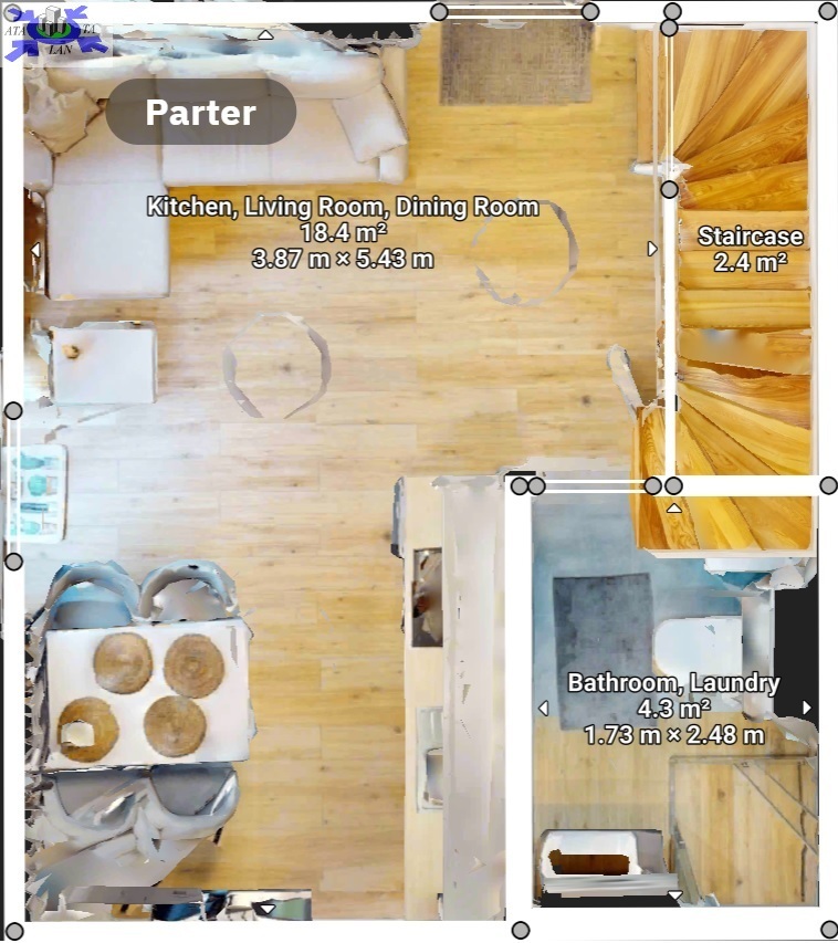 wraz z ogródkiem na parterze oraz z częścią sypialną na piętrze (2 oddzielne pokoje).