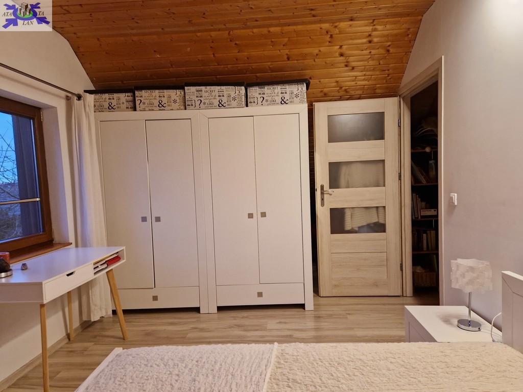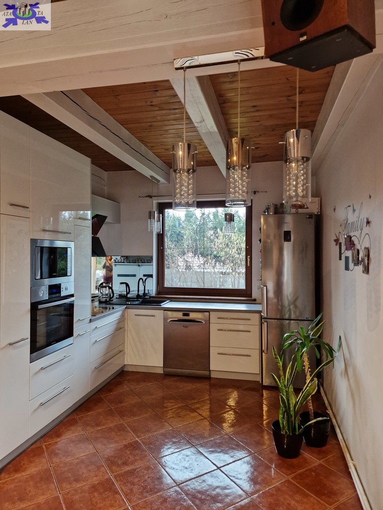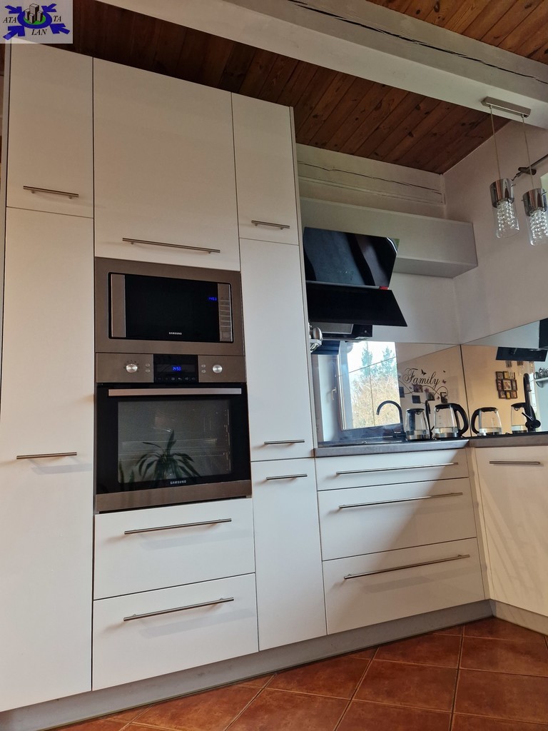 Spójna przestrzeń salon połączony z otwartą, funkcjonalną kuchnią z pełnym wyposażeniem doświetloną oknem. Kominek, z salonu bezpośrednie wyjście na taras i ogród.