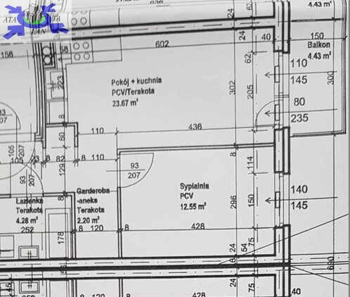 - salon z aneksem kuchennym ( 23,67 m2 ) z wyjściem na balkon ( 4,43 m2 ) od strony południowej z pięknym widokiem na panoramę miasta,
