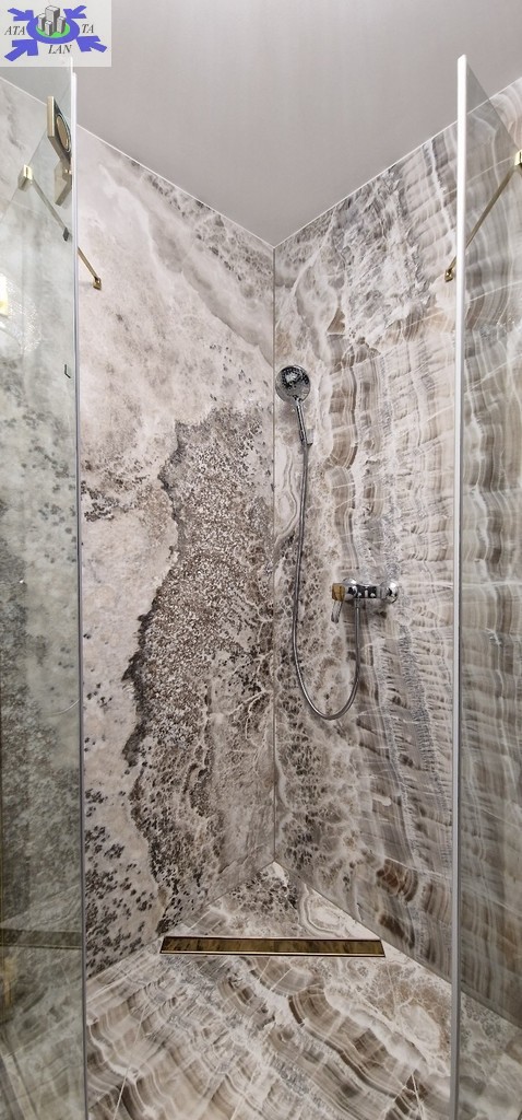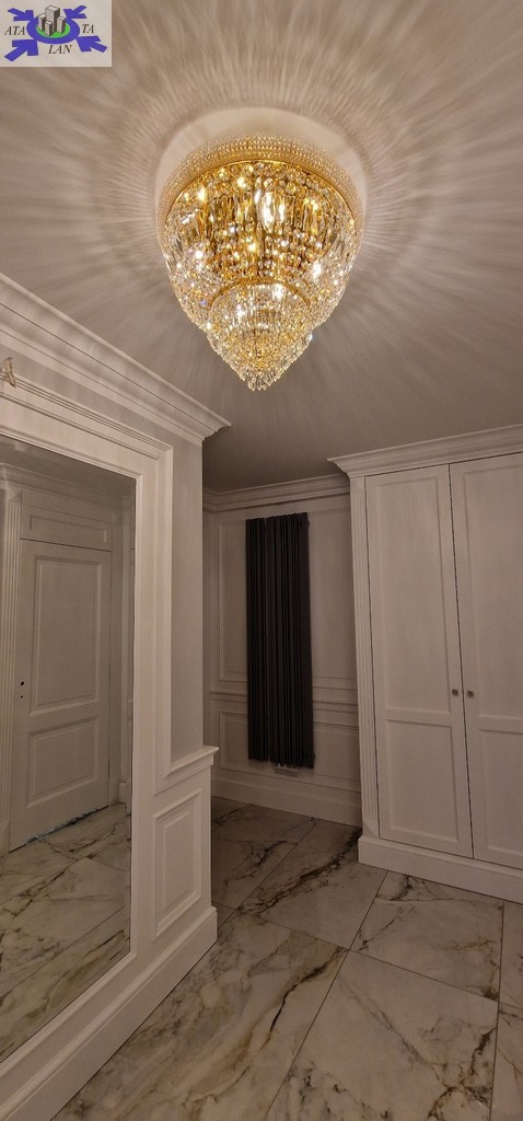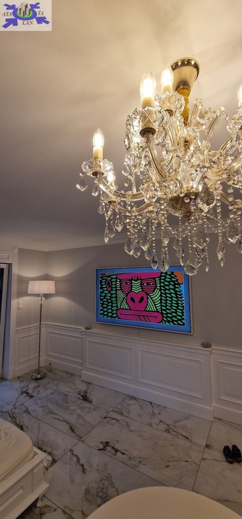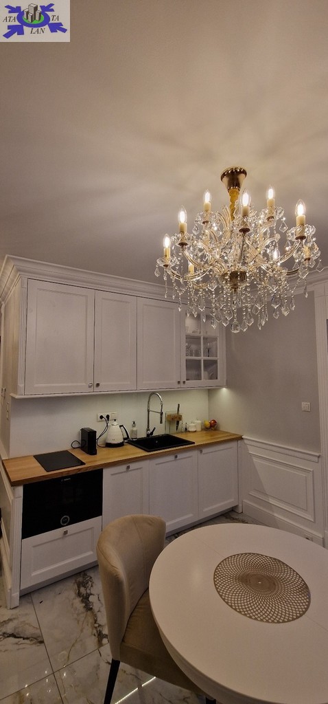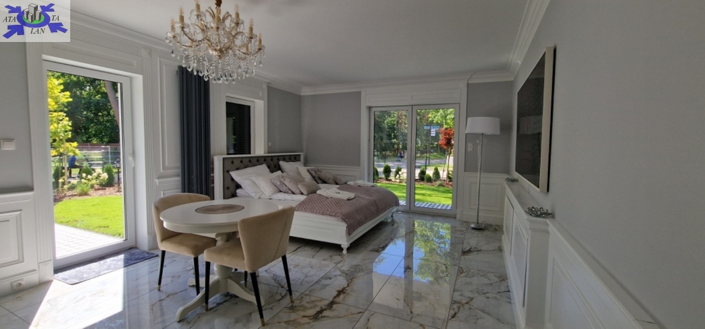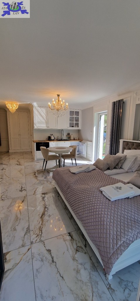 Tapicerowane niezwykle wygodne łóżko kontynentalne zostało wykonane na zamówienie. Sufity zdobią piękne, luksusowe żyrandole sprowadzone z Włoch. W kuchni znajdują się wysokiej klasy meble z pięknym drewnianym blatem oraz sprzęty renomowanej marki BOSCH. W niezwykle szykownej łazience zastosowano wielkoformatowe spieki,czyli kafle bez fug. Biały montaż luksusowej marki Villeroy&Boch, zaś armatura Hansgrohe.