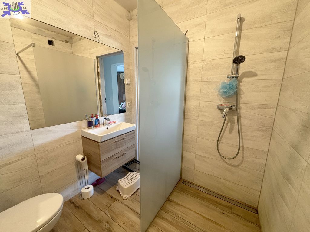 Podłogi na parterze domu pokryte terakotą, ściany wygładzone i pomalowane. Łazienka na parterze z prysznicem, w glazurze i terakocie.