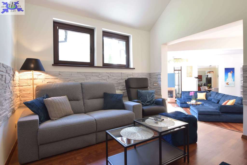 - przestronny salon o powierzchni ponad 40m2 ze ścianą okien z powalającym widokiem na ogród i ścianę lasu