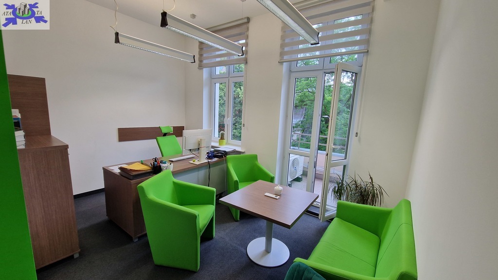 Nieruchomość ogrzewana z pieca gazowego dodatkowo posiada również zamontowaną klimatyzację. Jeden z pokoi biurowych posiada balkon z widokiem na Park Generała Andersa.