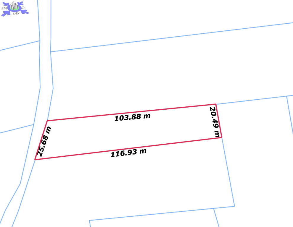 Nieruchomość kształtem zbliżona do prostokąta, o wymiarach podanych na zdjęciu w ofercie. (WYMIARY SĄ ORIENTACYJNE)