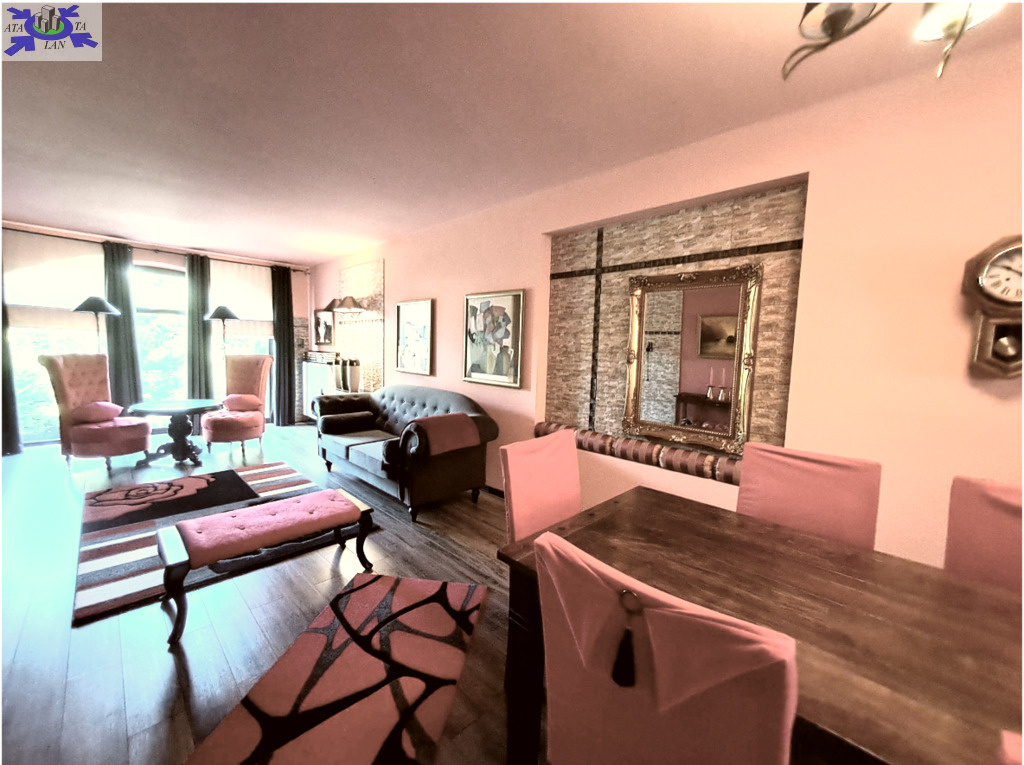 -Po lewej stronie wejście do przestronnego salonu z aneksem kuchennym ok. 50 m2, okna z dwóch stron na zimozielony ogród . W salonie i aneksie ciekawe wykończenie ścian kamieniem, które ładnie są wkomponowane w całość wystroju wnętrza.