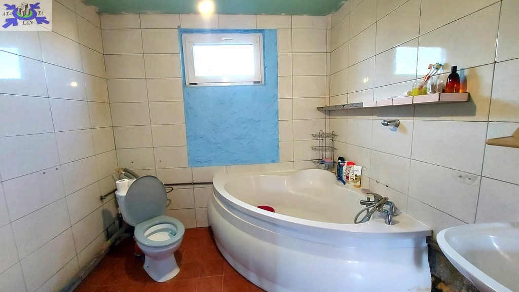 Dach kryty dachówką. Ogrzewanie z pieca na opał stały. Bieżąca ciepła woda z podgrzewacza elektrycznego. Dom po częściowym remoncie. Część wymaga gruntownego remontu, obecnie pełni funkcje gospodarczą. Budynek częściowo podpiwniczony, ca 15m2. Kanalizacja w formie szamba.