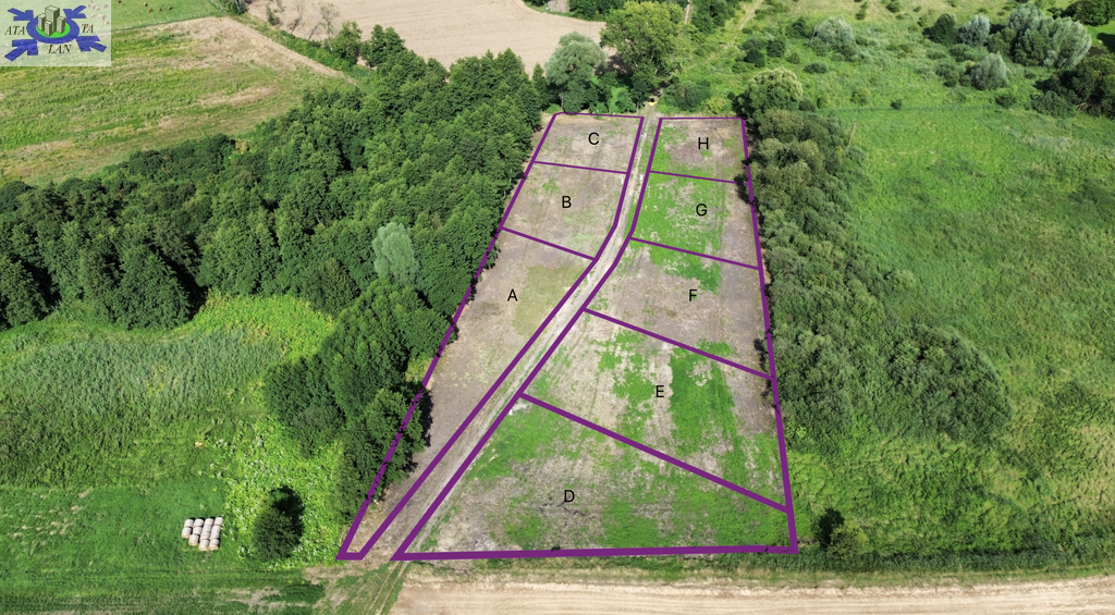 Dostępnych jest łącznie 8 działek z wydanymi warunkami zabudowy oznaczone jako "A"-"H" (1364m2 1214m2 1174m2 1185m2 1379m2 1286m2 1259m2 oraz 1259m2).