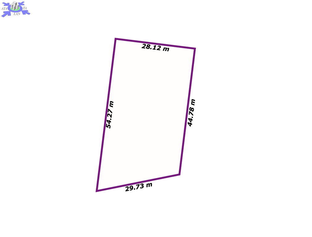 Kształt działki zbliżony do trapezu, wymiary ok. 28m x 54m.