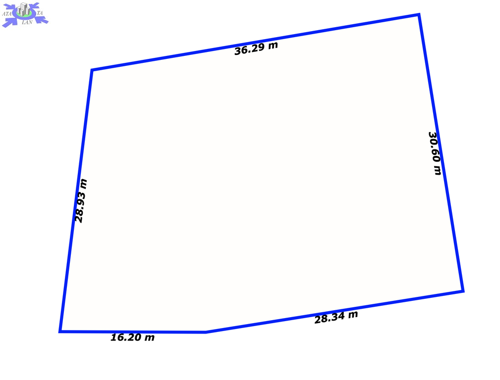 Kształt działki zbliżony do trapezu, wymiary ok. 36m x 30m.