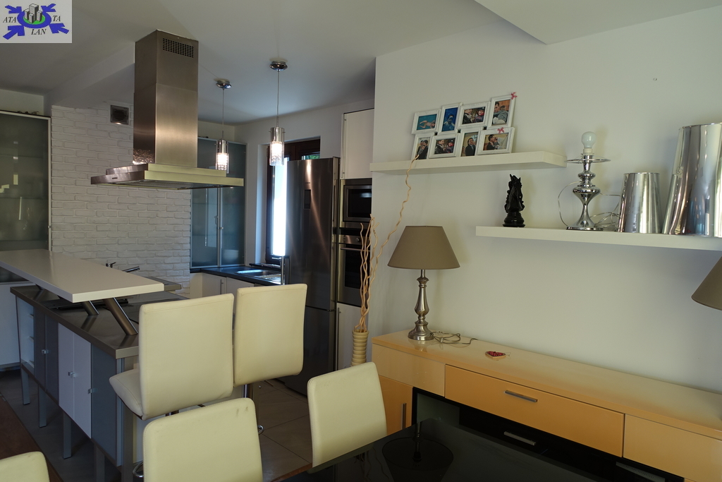 Perfectly located new house in Mierzyn. Furnished and arranged. AVAILABLE IMMEDIATELY. Living room with fireplace, kitchen with dining room, 3 bedrooms, bathroom, toilet, vestibule and garage. High quality materials were used for construction. Porotherm, roof covered with ceramic tiles. Wooden windows, roof windows. Anti-burglary external doors. House insulated with polystyrene, plastered. Solar panels installed on the roof. Furnished, kitchen with built-in furniture and appliances. Built in 1999. Plot area 502 m2. Usable area 120 m2, total area 150 m2. House HOUSE DESCRIPTION GROUND FLOOR living room combined with bright kitchen and dining room approx. 55 m2, hall approx. 8 m2, toilet 3 m2, vestibule 2.5 m2, boiler room with garage approx. 24 m2 From the living room exit to the garden and terrace. On the floors, panels and terracotta. Built-in kitchen furniture with household appliances from Siemens and Bosch fridge with freezer, 60 cm dishwasher, ceramic hob, oven. In the garden, a gazebo, a barbecue area and a round swimming pool with a diameter of 5.5 m. FIRST FLOOR 3 bedrooms with, among others, skylights, a bathroom of 12.5 m2 m2 with a bathtub, shower cubicle, toilet and bidet and washbasin. Large balcony of 12 m2. Comfortable, wide stairs between floors. The building has water and sewage installations. Heating and hot water from a gas furnace and photovoltaics. From the windows, a view of distant properties and greenery. The area in front of the building is paved with cubes. Fence with a gate. Location close to the exit towards the border. Rental price PLN 6,900 + utilities.
