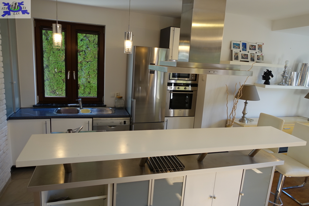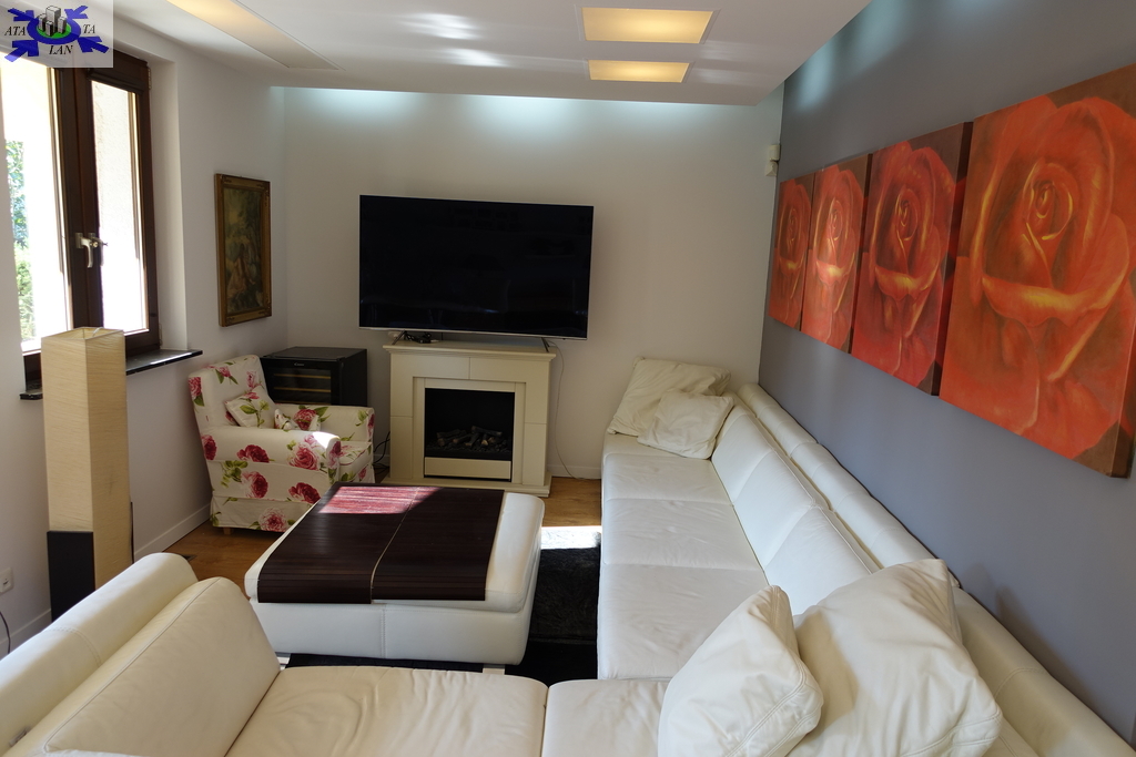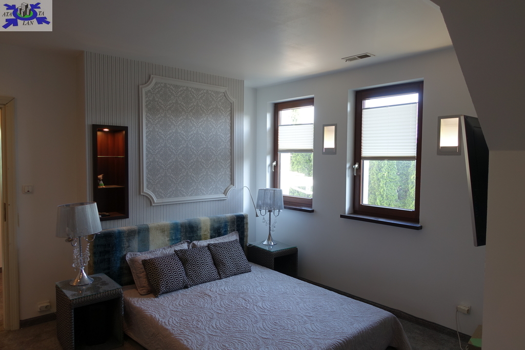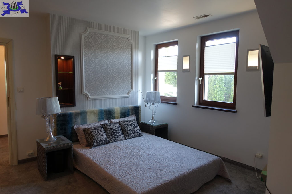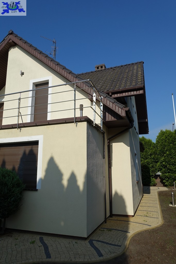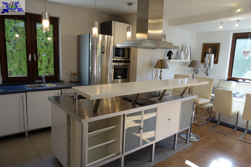 This new, detached house in Mierzyn, ideally located in a quiet area, was built with high-quality materials in 1999. Quick delivery. It features a living room with a fireplace, a kitchen with a dining area, three bedrooms, a bathroom, a toilet, a vestibule, and a garage. High-quality materials were used in the construction, including Porotherm, a tiled roof. Wooden windows and attic windows. Burglar-proof exterior doors. The house is insulated with Styrofoam and plastered. Solar panels are installed on the roof. Furnished, with a kitchen with built-ins and appliances. The usable area is 120 m2, with a total area of 150 m2. A single-car garage is built into the building. The windows are equipped with automatic roller shutters. PLOT Plot area 502 m2. HOUSE DESCRIPTION GROUND FLOOR Living room with a bright kitchen and dining area of approx. 55 m2, hall of approx. 8 m2, toilet of 3 m2, vestibule of 2.5 m2, boiler room with garage of approx. 24 m2. The living room offers access to the terrace and garden. Floors are laminate and terracotta. Built-in kitchen units with Siemens and Bosch appliances refrigerator with freezer, 60 cm dishwasher, ceramic hob, and oven. The garden features a gazebo, barbecue area, and a heated, circular swimming pool with a diameter of 5.5 m. FIRST FLOOR 3 bedrooms with skylights, among other features, a 12.5 m2 bathroom with a bathtub, shower, toilet, bidet, and washbasin. A large 12 m2 balcony. Comfortable, wide stairs between floors. The building is equipped with plumbing and sewage systems. Heating and hot water are provided by a gas boiler and photovoltaics. The windows overlook distant properties and greenery. The area in front of the building is paved. Fenced with a remote-controlled gate. Located near the border exit.