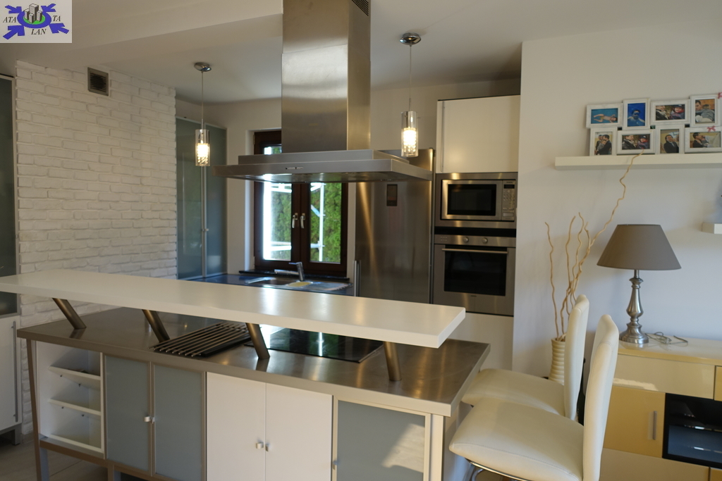 Z salonu wyjście na taras i do ogrodu. Na podłogach panele i terakota. Meble kuchenne w zabudowie wraz ze sprzętem AGD firmy Siemens oraz Bosch lodówka z zamrażarką, zmywarka 60 cm, płyta ceramiczna, piekarnik.