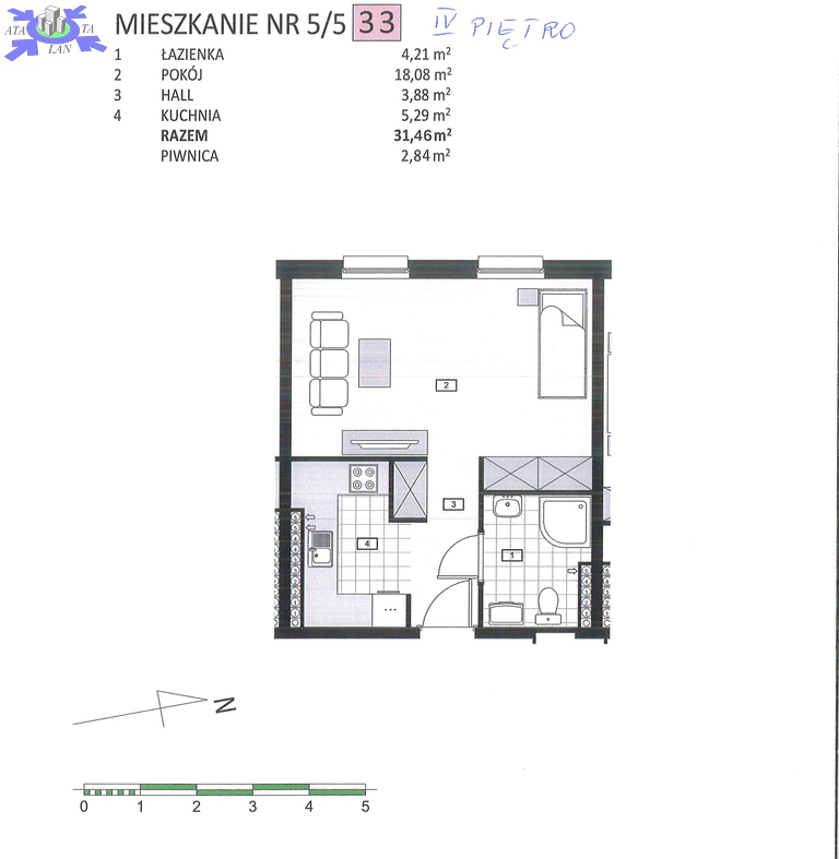 Przedmiotowe mieszkanie znajduje się na CZWARTYM PIĘTRZE. Składa się z pokoju dziennego o powierzchni 18,08mkw, kuchni 5,29mkw łazienki 4,21mkw oraz hallu 3,88mkw. Do mieszkania przynależy piwnica o powierzchni 2,79mkw.