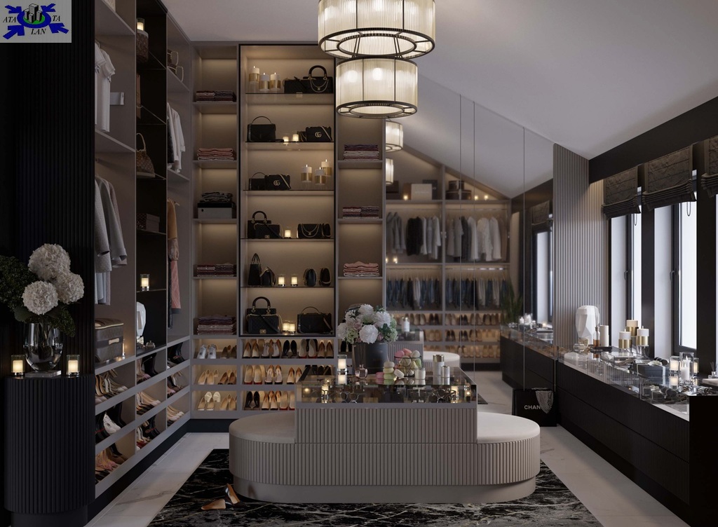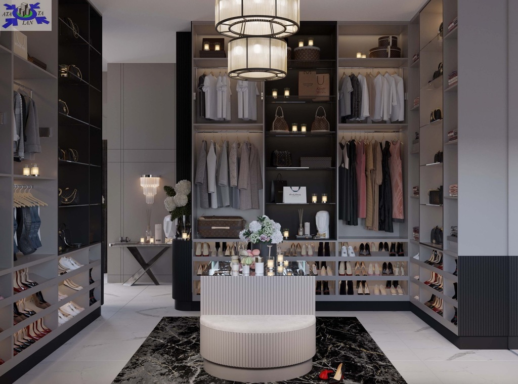 Jedna z dwóch głównych sypialni o pow. 20,81 m2 ,znajduje się na parterze, po prawej stronie od wejścia i obejmuje dużą, luksusową łazienkę o pow. 13,65 m2 oraz garderobę składającą się z dwóch połączonych pomieszczeń, wyposażonych w elegancką zabudowę. Pierwsze pomieszczenie garderoby ma pow.10,80 m2 drugie o pow. 11,95 m2. Garderoba ta pozwala na podział na część damską i męską lub letnią i zimową, według uznania.