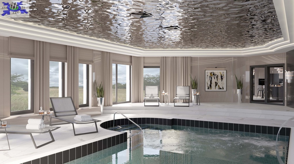 Rezydencja wyposażona jest w prywatny basen, saunę, jacuzzi oraz przestrzeń do ćwiczeń. Do tej strefy przechodzi się z jadalni przez przedsionek, który również prowadzi do części strefy rozrywkowej, czyli pokoju z bilardem. W strefie Spa znajdziemy imponujący basen o wymiarach niecki basenowej dł. 907 cm oraz sz. 403 cm. W pomieszczeniu znajdziemy również jacuzzi. Całe pomieszczenie ma 121 m2 oraz 290 cm wysokości w najniższym miejscu a w najwyższym 320 cm. Z tego pomieszczenia mamy dostęp do sauny o pow. 4,31 m2 i wys. 217 cm oraz do łazienki z WC o pow. 5,27 m2 i wys. 290 cm. Strefa Spa posiada liczne okna, co sprawia, że to miejsce jest świetnie doświetlone.