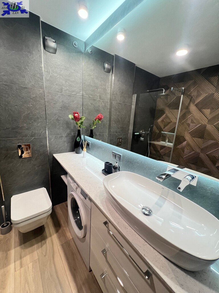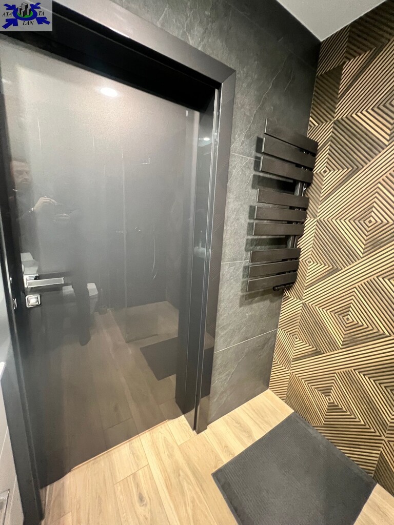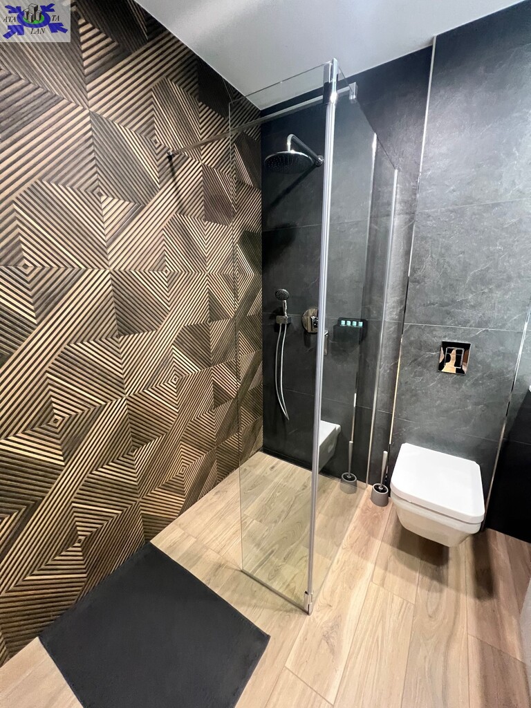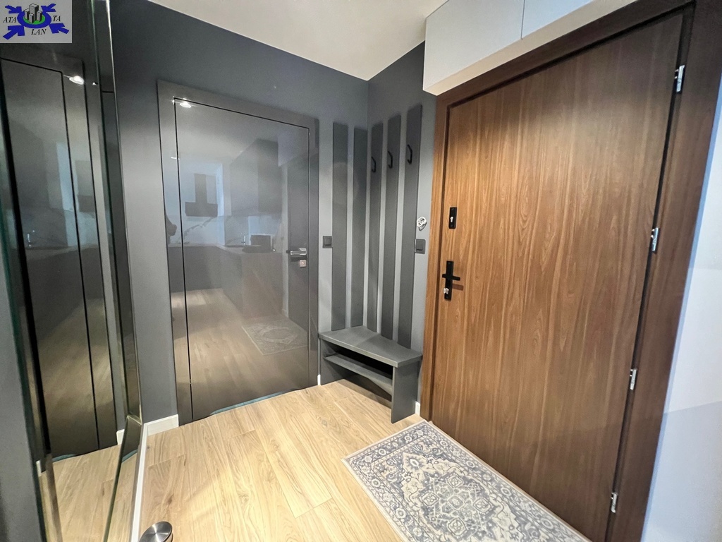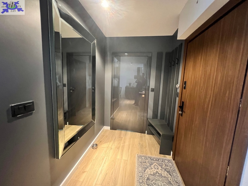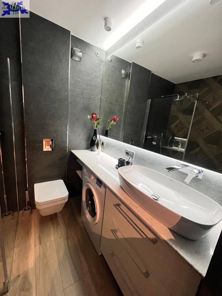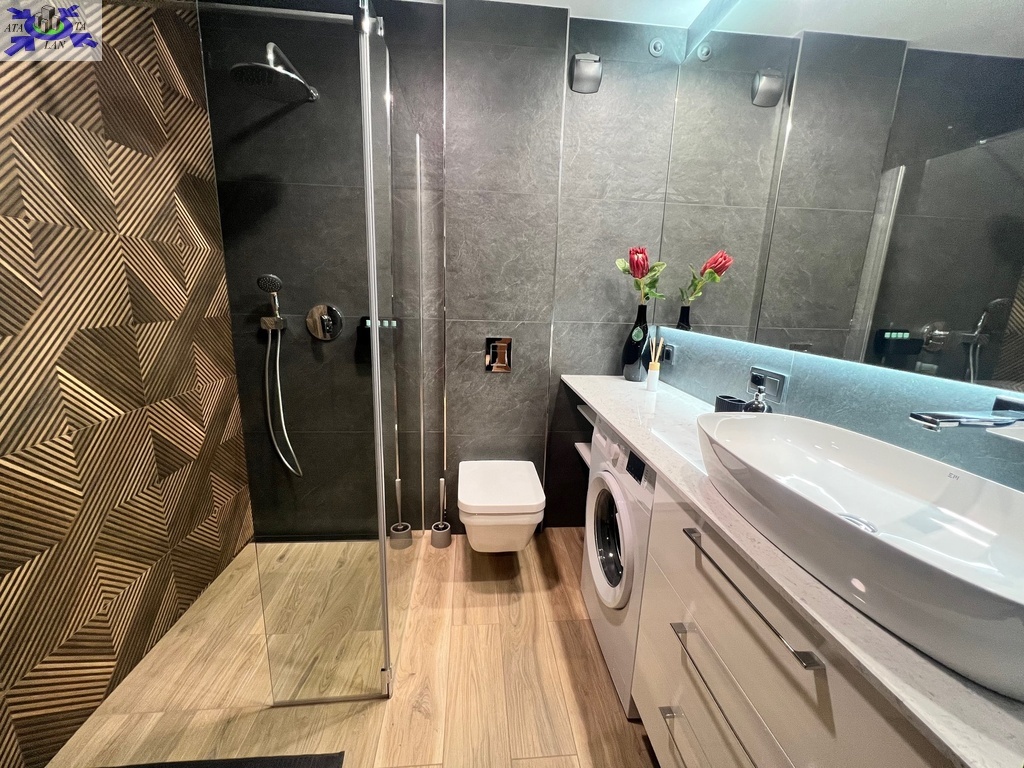 Elegancka łazienka z prysznicem, lustrem na całą ścianę i nową pralką, a także przedpokój z lustrem i wieszakami podkreślają wyjątkowość tego apartamentu.