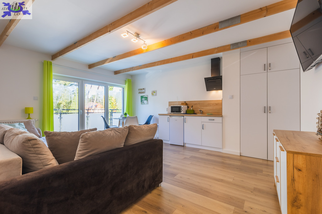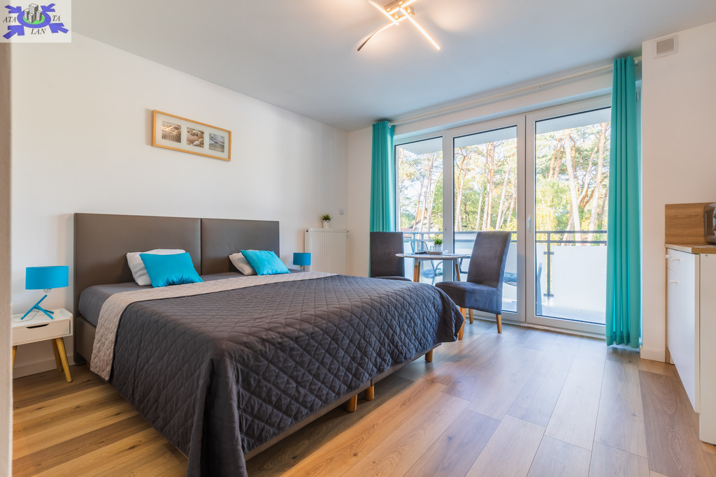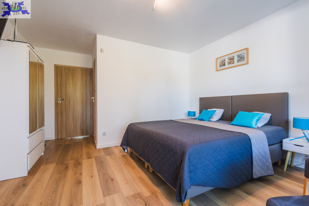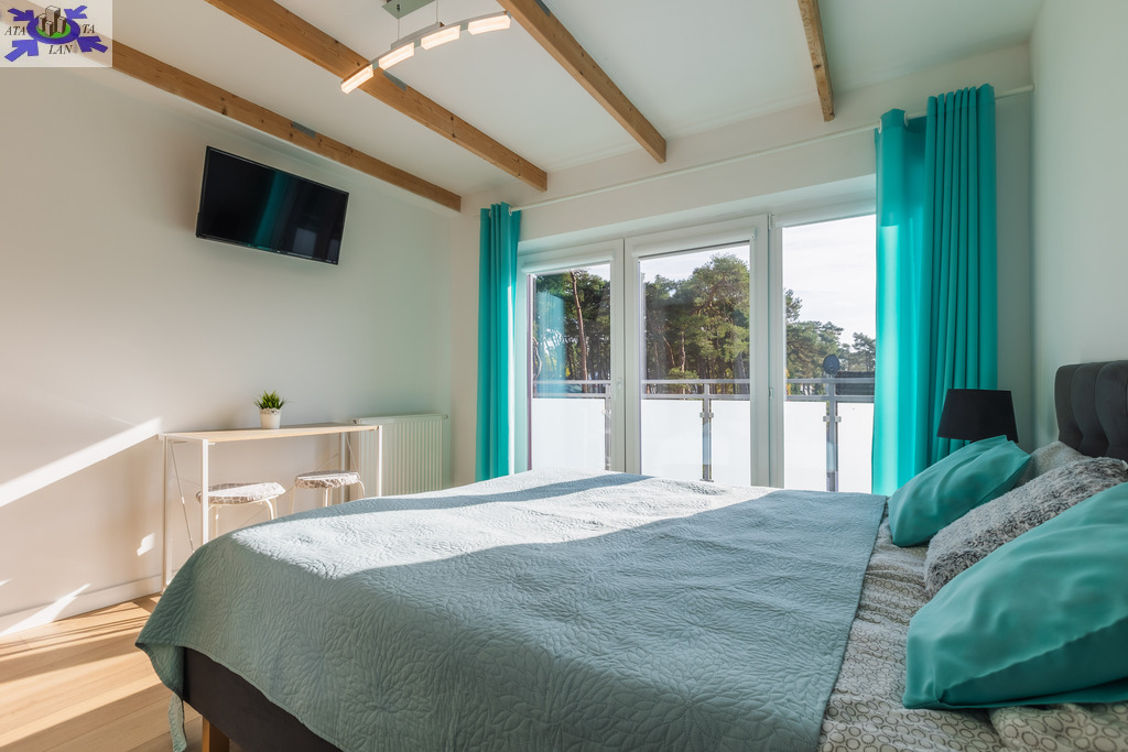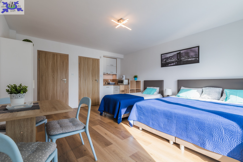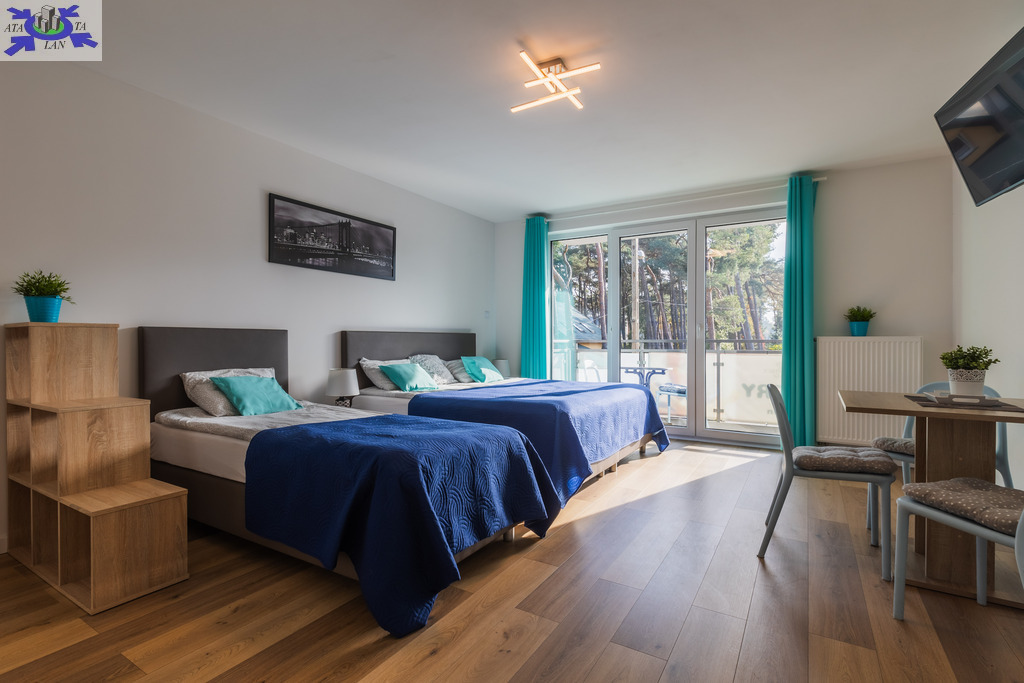Pokoje wyposażone są w wygodne łóżka kontynentalne oraz sofy rozkładane, stoły wraz z krzesłami, szafy, tv 40 i 50 calowe.. W każdym z pokoi znajduje się także lodówka, mikrofalówka, czajnik, komplet naczyń, sprzęt plażowy.