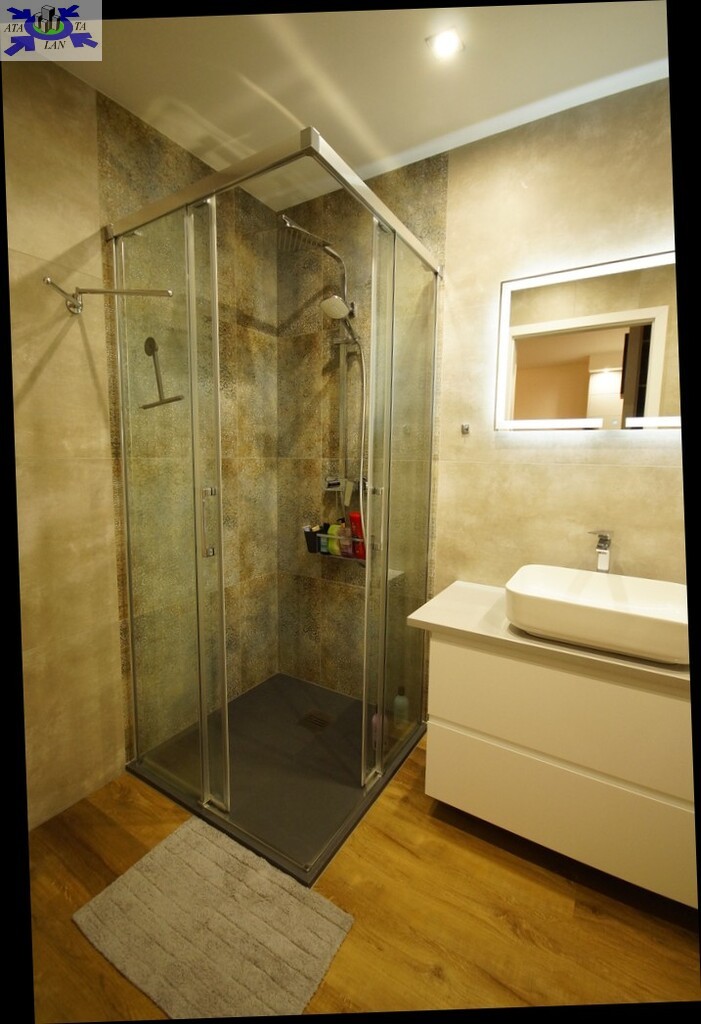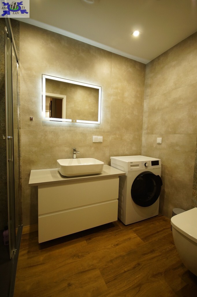 - Łazienka o powierzchni 4,4 m2 uposażona w umywalkę nad którą znajduje się podświetlane lustro, kabinę prysznicową oraz pralkę, na podłodze laminat.