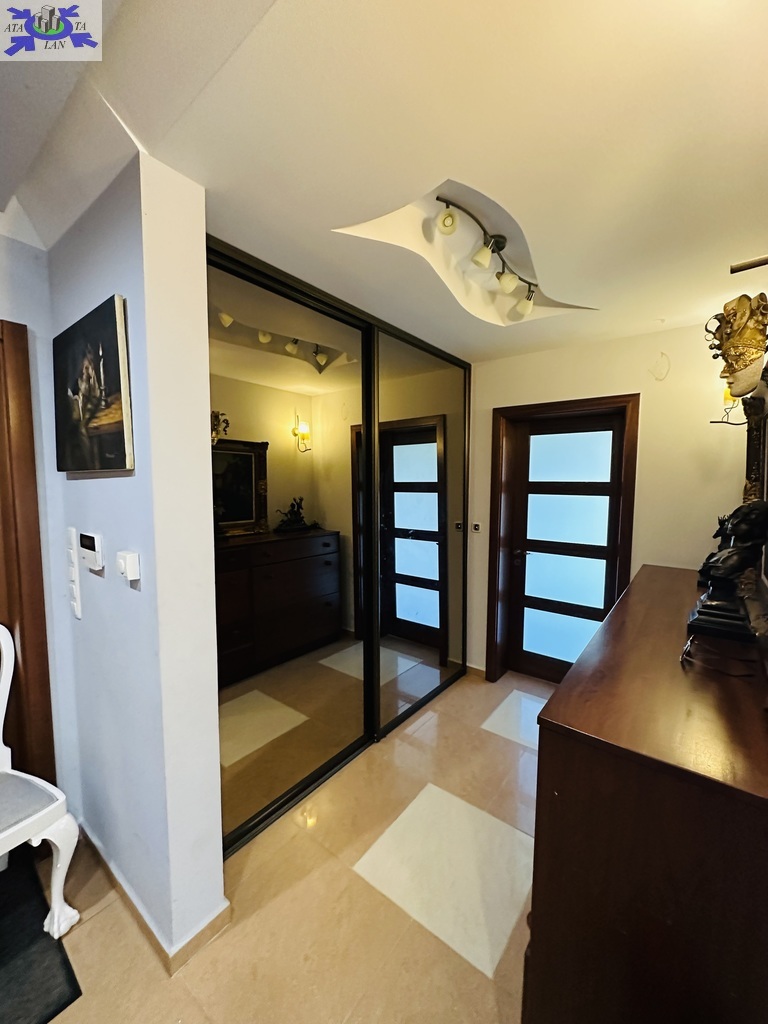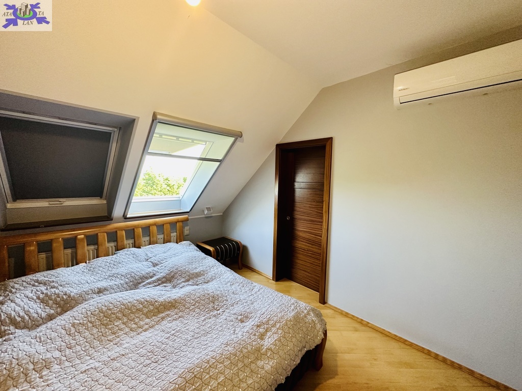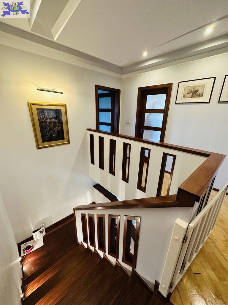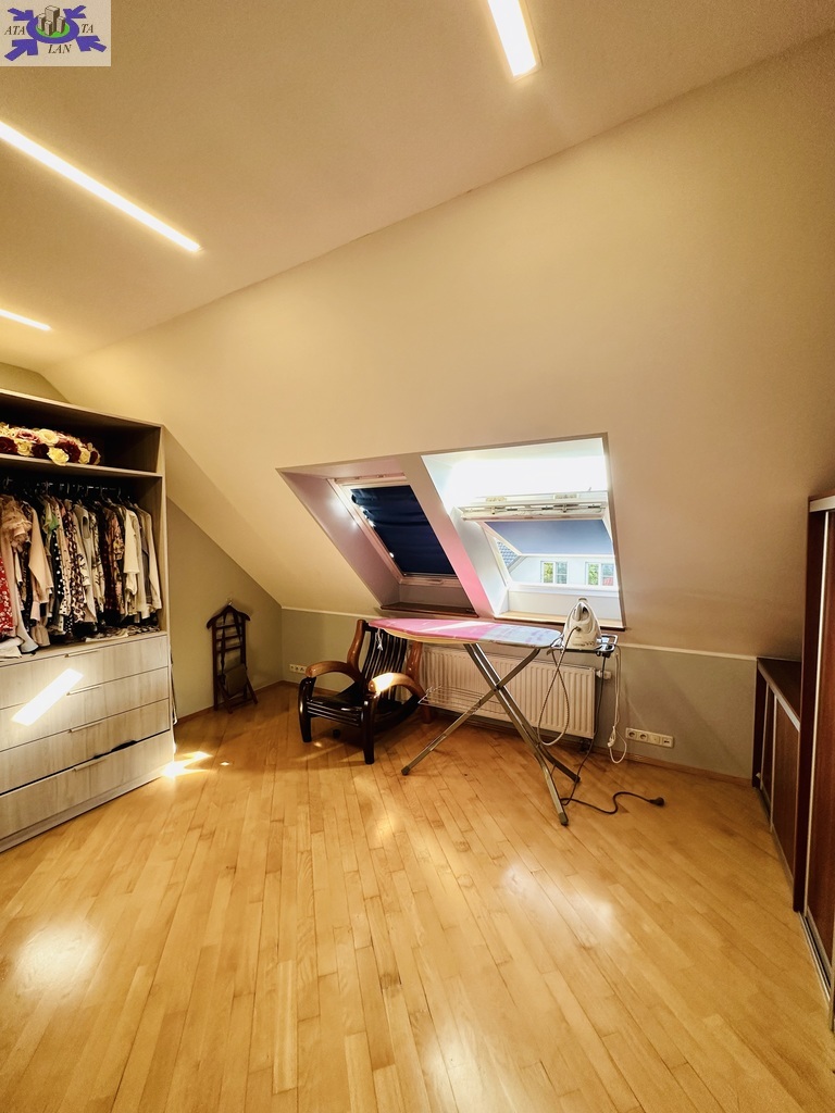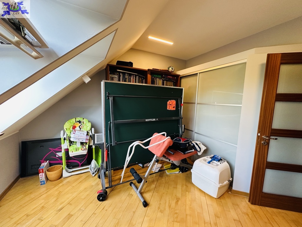 Szerokie schody prowadzą na piętro domu gdzie znajduje się 5 sypialni/ 10,74 m2, 12,86 m2, 13,68 m2, 13,95 m2, 18,85 m2/z czego jedna z sypialni ma prywatną łazienkę i garderobę. Dodatkowa łazienka z wejściem z hollu.