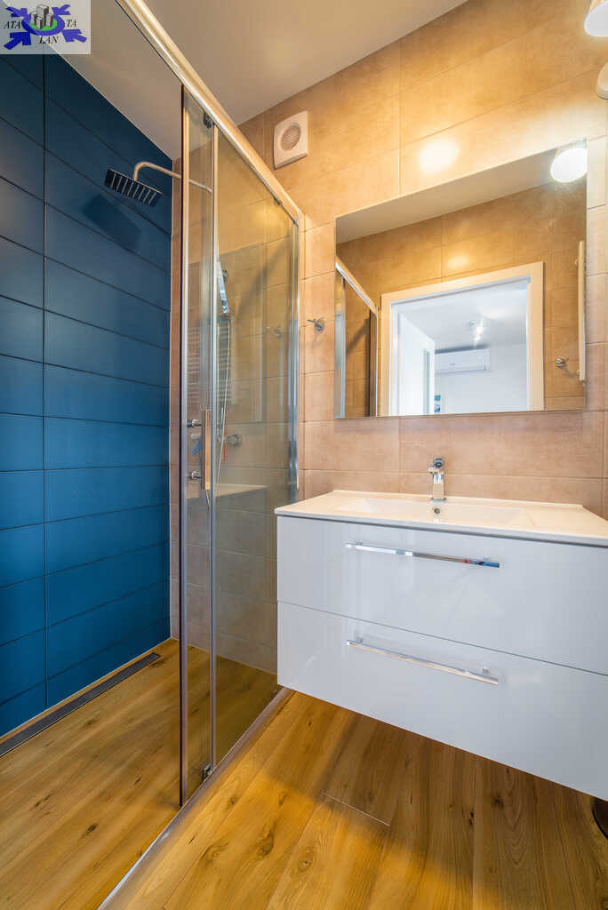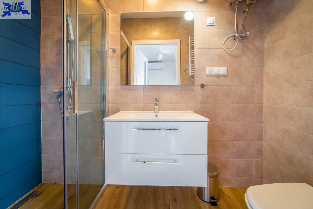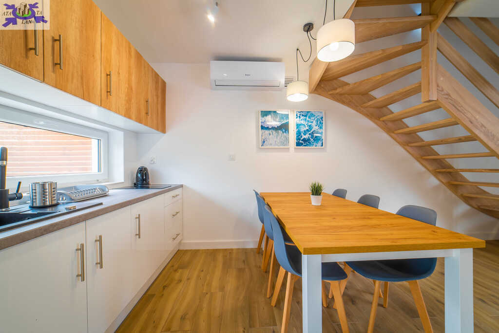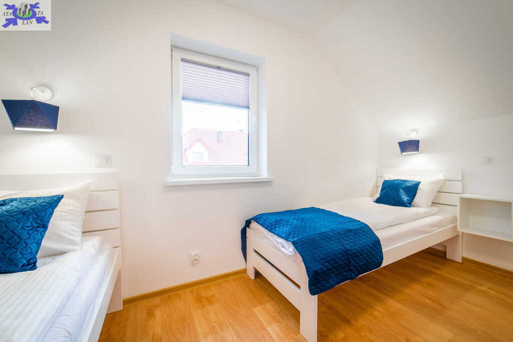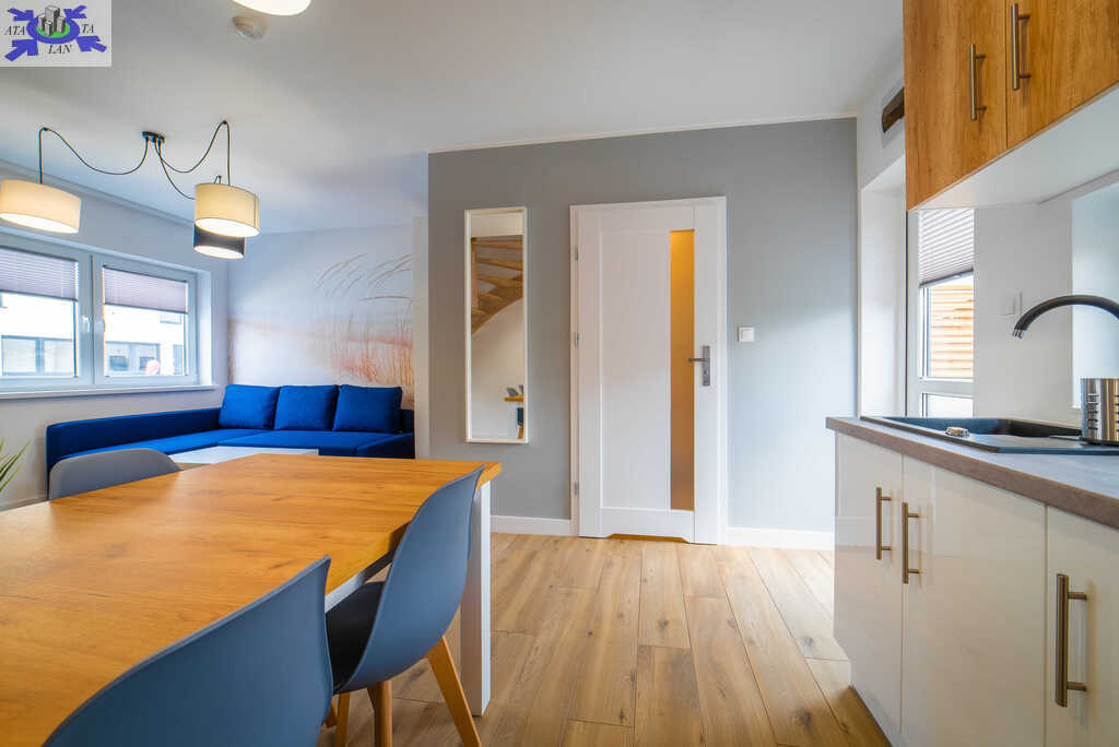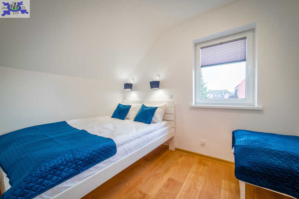 Rozkład domku - Parter Pokój dzienny (kanapa, stolik, szafa, telewizor), aneks kuchenny (w pełni wyposażony lodówka, płyta indukcyjna, czajnik, ekspres do kawy, toster, talerze, sztućce, szklanki, garnki stół z krzesłami), łazienka (kabina prysznicowa, wc, umywalka), taras (zadaszenie w formie markizy, grill, meble ogrodowe) - Poddasze Sypialnia (łóżko pojedyncze, łózko podwójne, komoda), sypialnia (łóżko pojedyncze, łóżko podwójne, komoda, szafa), toaleta. - Na wyposażeniu domków leżaki, parawany, parasole, pościel, ręczniki, dodatkowo wszystkie akcesoria dla dzieci (łóżeczka, foteliki do karmienia, nocniki, bramki zabezpieczające, nakładki wc), wózki plażowe, żelazka, deski.