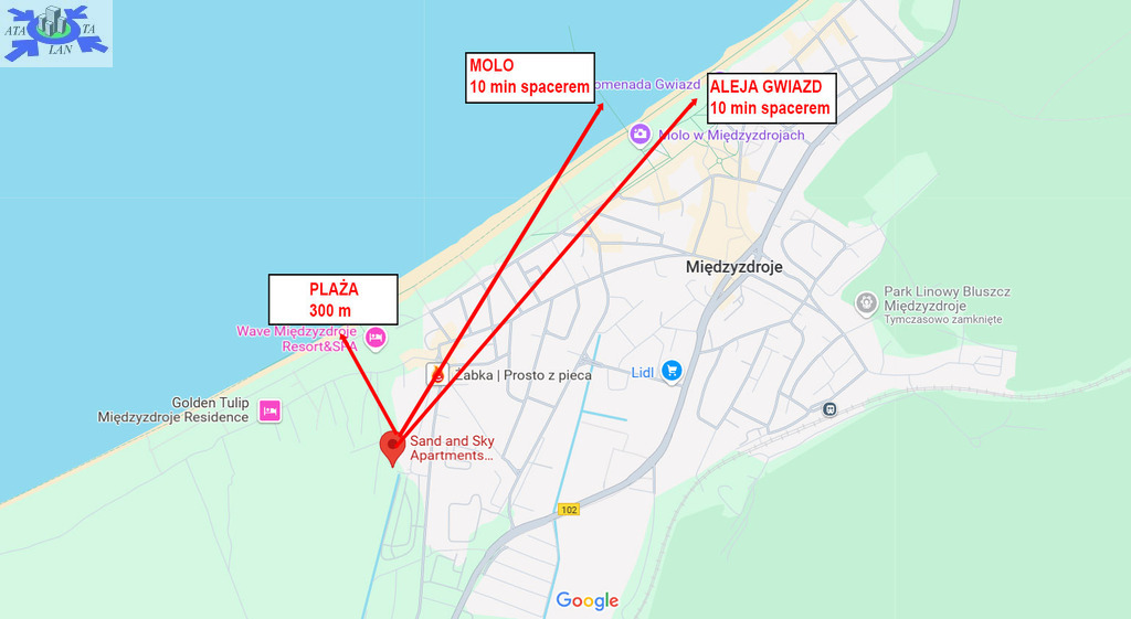Apartamentowiec znajduje się w drugiej linii zabudowy, oddalony w linii prostej o 400 m od piaszczystej plaży.
