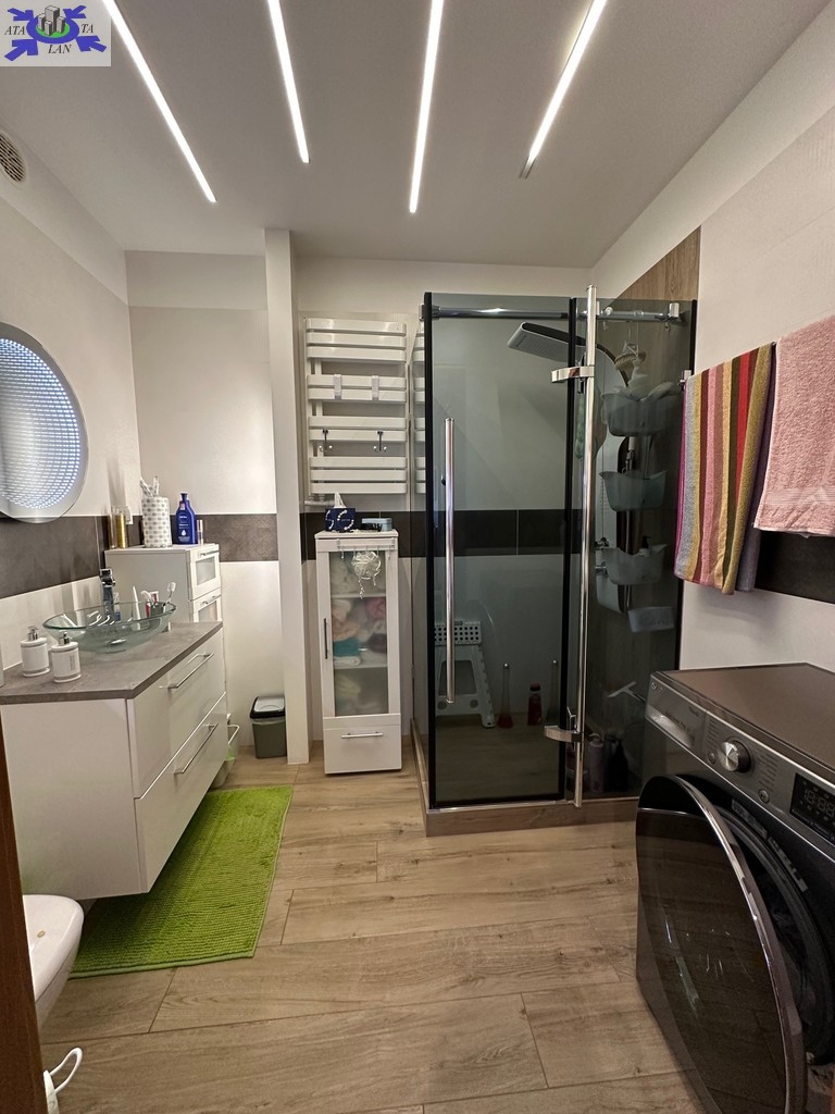 WC zostało połączone z łazienką i uzyskano ładną nowoczesną i przestronną przestrzeń, w której znalazł się prysznic z kaskadą, deszczownicą i masażami., muszla, umywalka, pralka oraz sporo powierzchni do przechowywania.