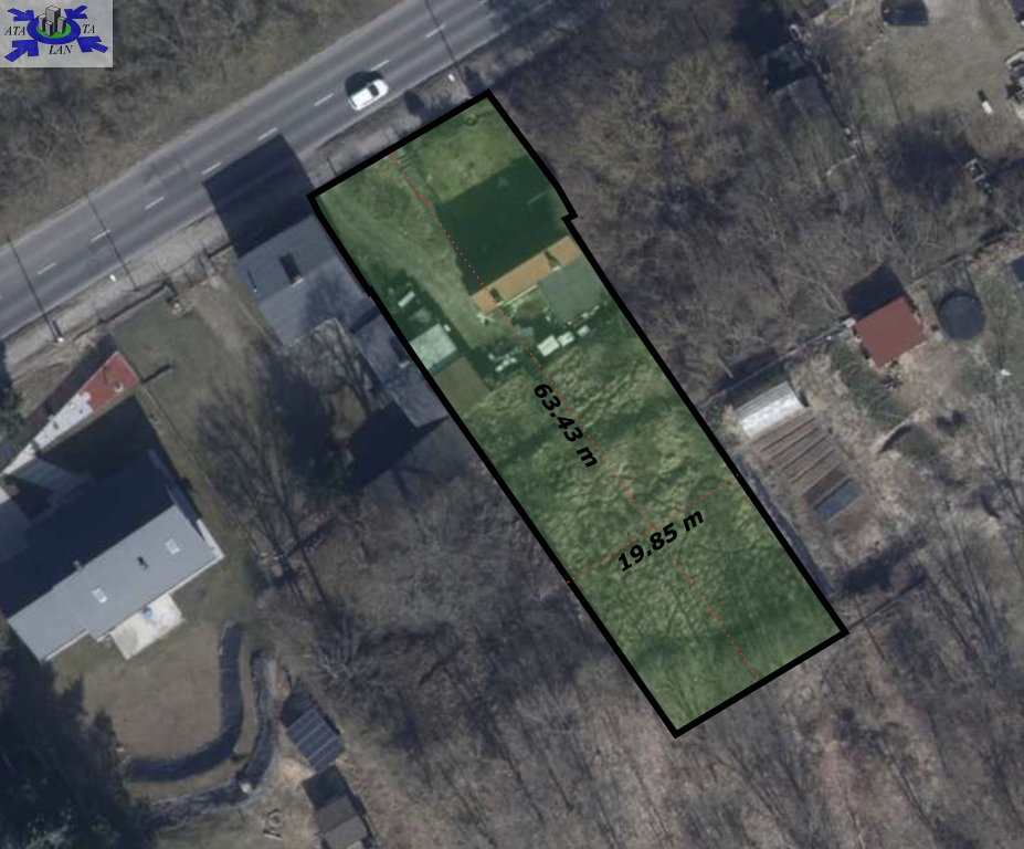 Nieruchomość jest w kształcie prostokąta w wymiarach ok. 64x20m.