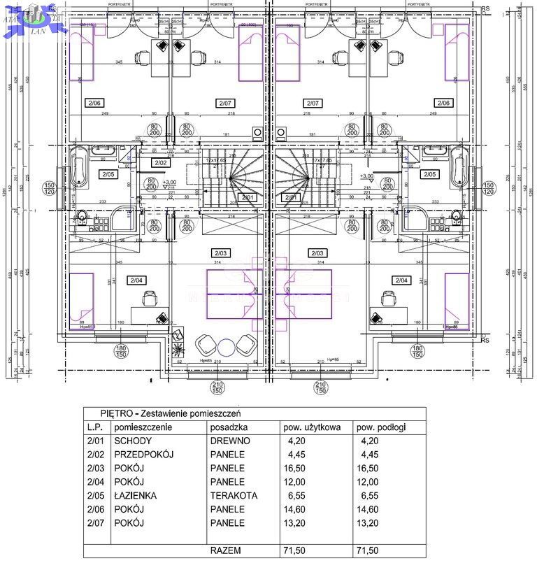 Parter domu stanowi salon 28,25m2 z aneksem kuchennym 7m2, wiatrołap, hol, kotłownia i przedpokój, łazienka na drugim poziomie znajdują się cztery sypialnie 12/13,2/14,6/16,5 m2,łazienka 6,5m2 oraz przedpokój. Dodatkowym atutem jest nieużytkowe poddasze o powierzchni 13m2.