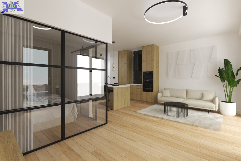Apartament o powierzchni 48,65, składa się z salonu z aneksem kuchennym, wydzielonej sypialni, łazienki, garderoby i holu.