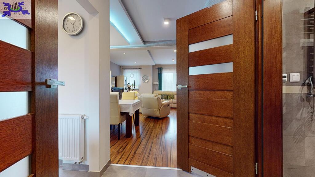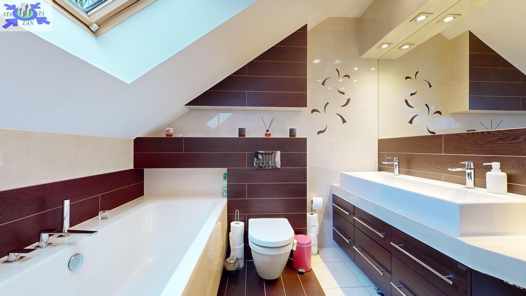 - Pomieszczenia 5 pokoi (salon, 3 sypialnie, biuro) w tym 1 w przyziemiu jako biuro, kuchnia, 2 łazienki, garaż, pomieszczenie techniczne z kolejną toaletą.Rozkład