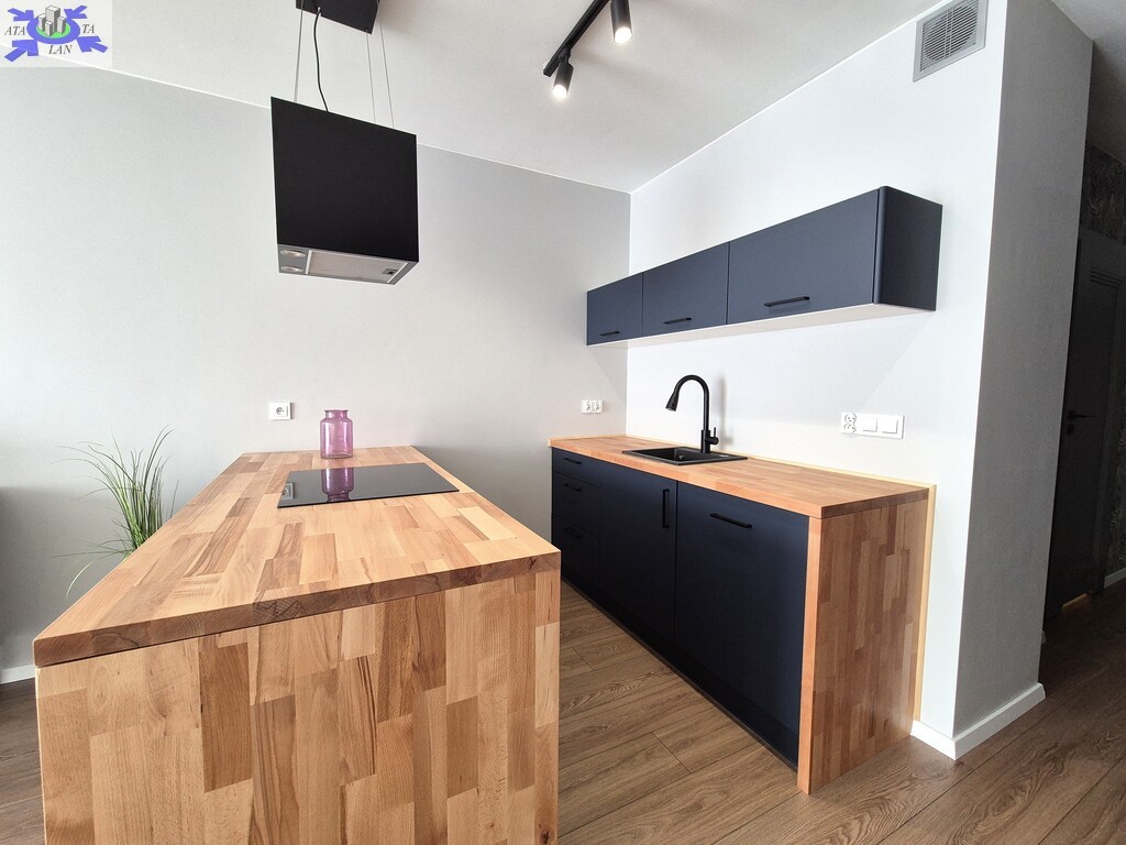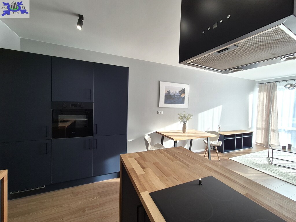- pokój z aneksem kuchennym. Część kuchenna w nowoczesnej zabudowie z wyspą. Na wyposażeniu płyta indukcyjna, zmywarka, piekarnik, zlew, lodówka z zamrażarką.