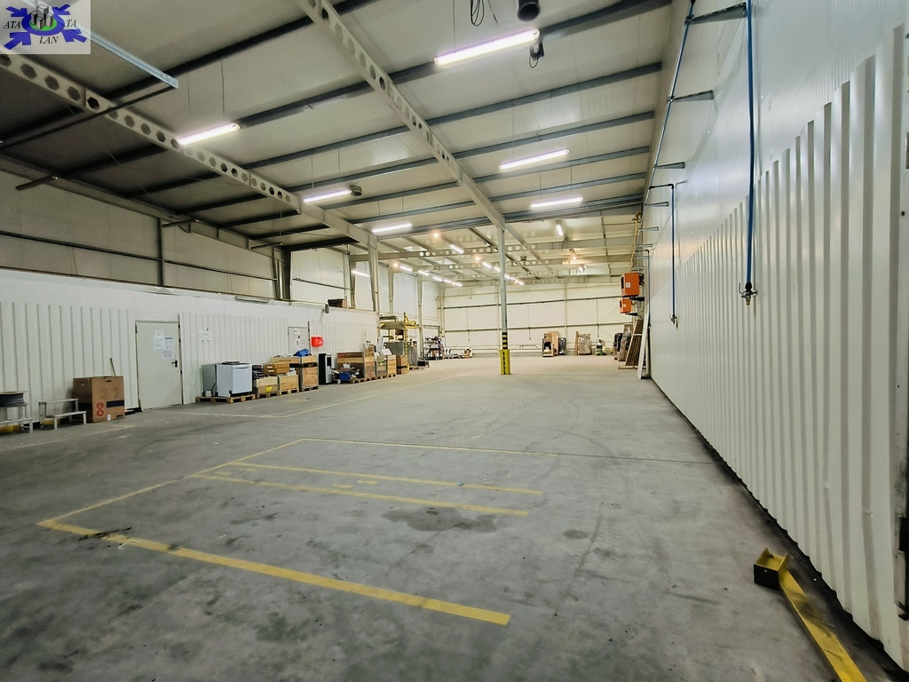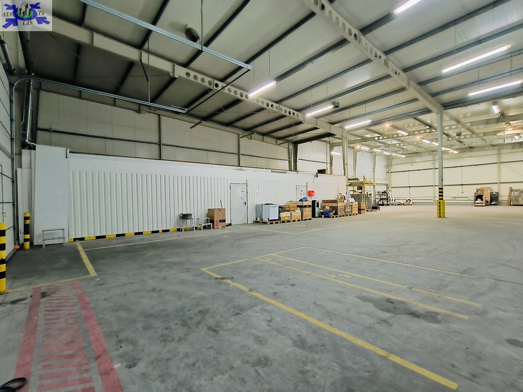 Dach i ściany hali magazynowej wykonane z płyt warstwowych. Posadzka betonowa, bezpyłowa.