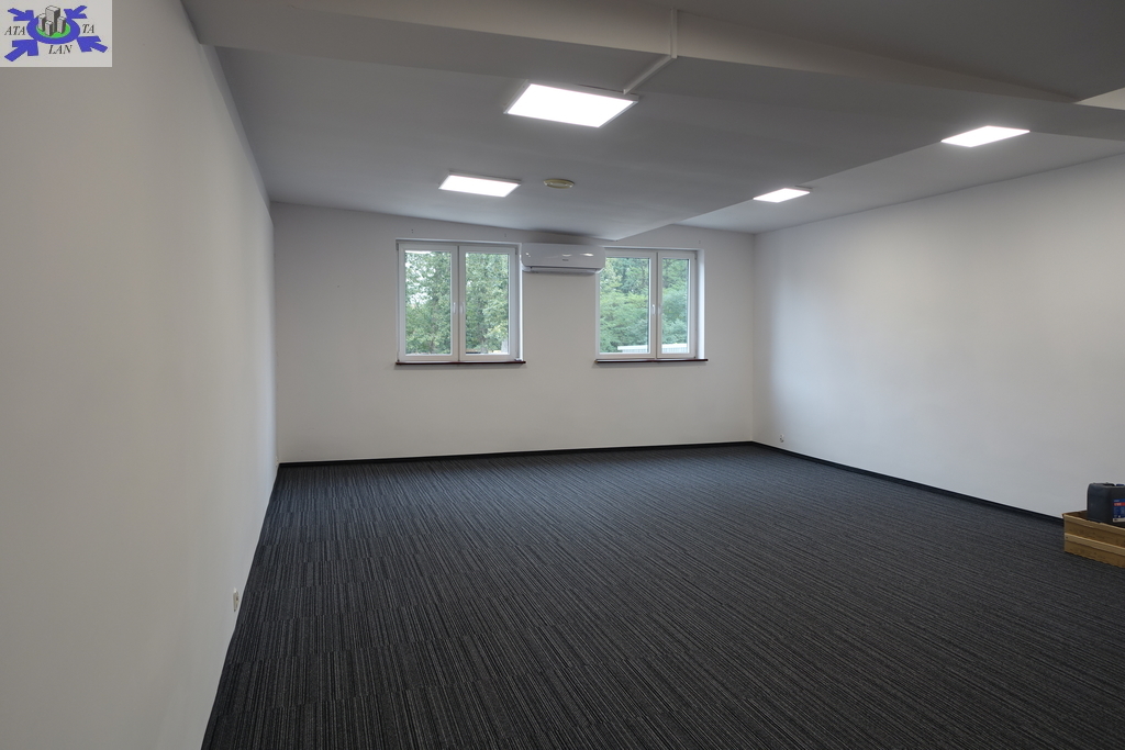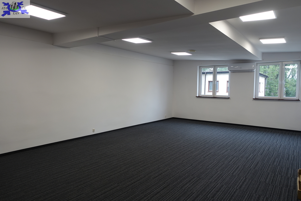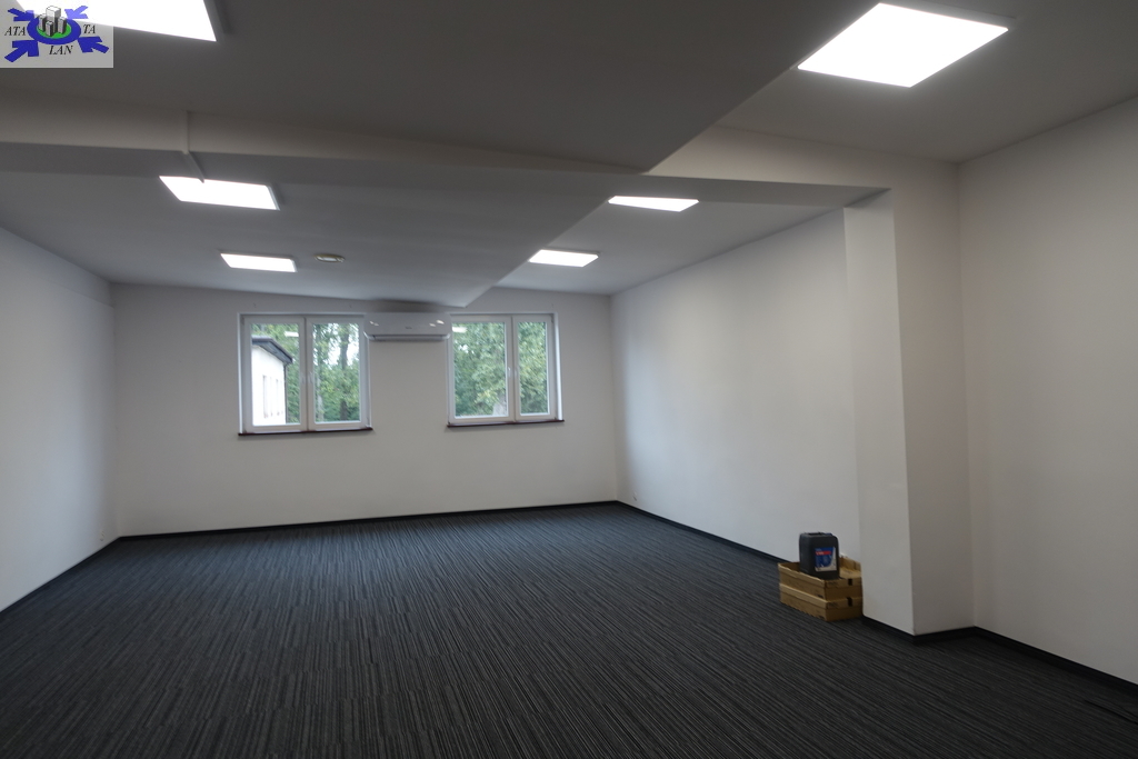Budynek w dobrym standardzie wykończenia. DO CENY NALEŻY DOLICZYĆ VAT. Na podłogach panele, ściany pomalowane na jasne kolory, instalacja elektryczna do pomieszczeń biurowych, biura ogrzewane i klimatyzowane (pompa ciepła), Zaplecze socjalne WC damskie i męskie - 7 kabin. Dostęp do linii telefonicznych faksowych, szybkich łączy internetowych. Opłata elektryczna wg wskazań podlicznika. Wynajem całości 25 zł/m2 + VAT. Możliwość wynajmu innych pomieszczeń, do dyspozycji dodatkowo biura o powierzchni 76 i 57 m2.