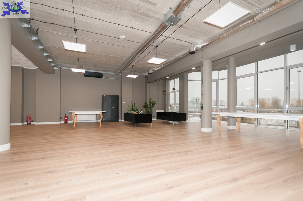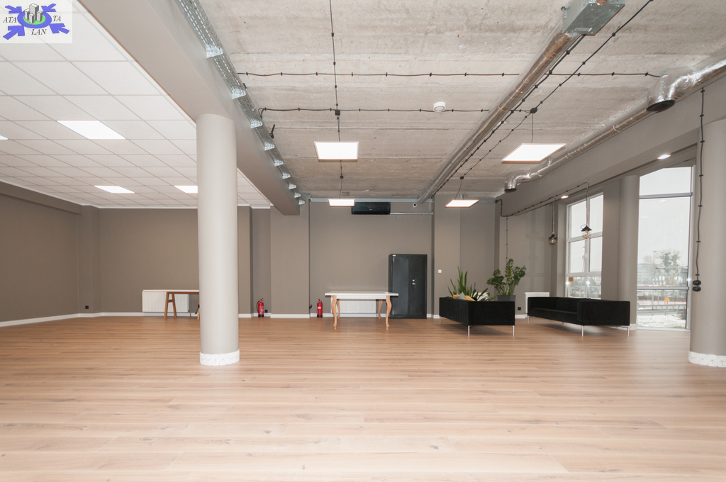 Na podłodze panele, sufity zrobione w stylu loftowym, ogrzewanie z pieca gazowego jak również w części sali głównej zamontowana klimatyzacja z funkcją grzania.